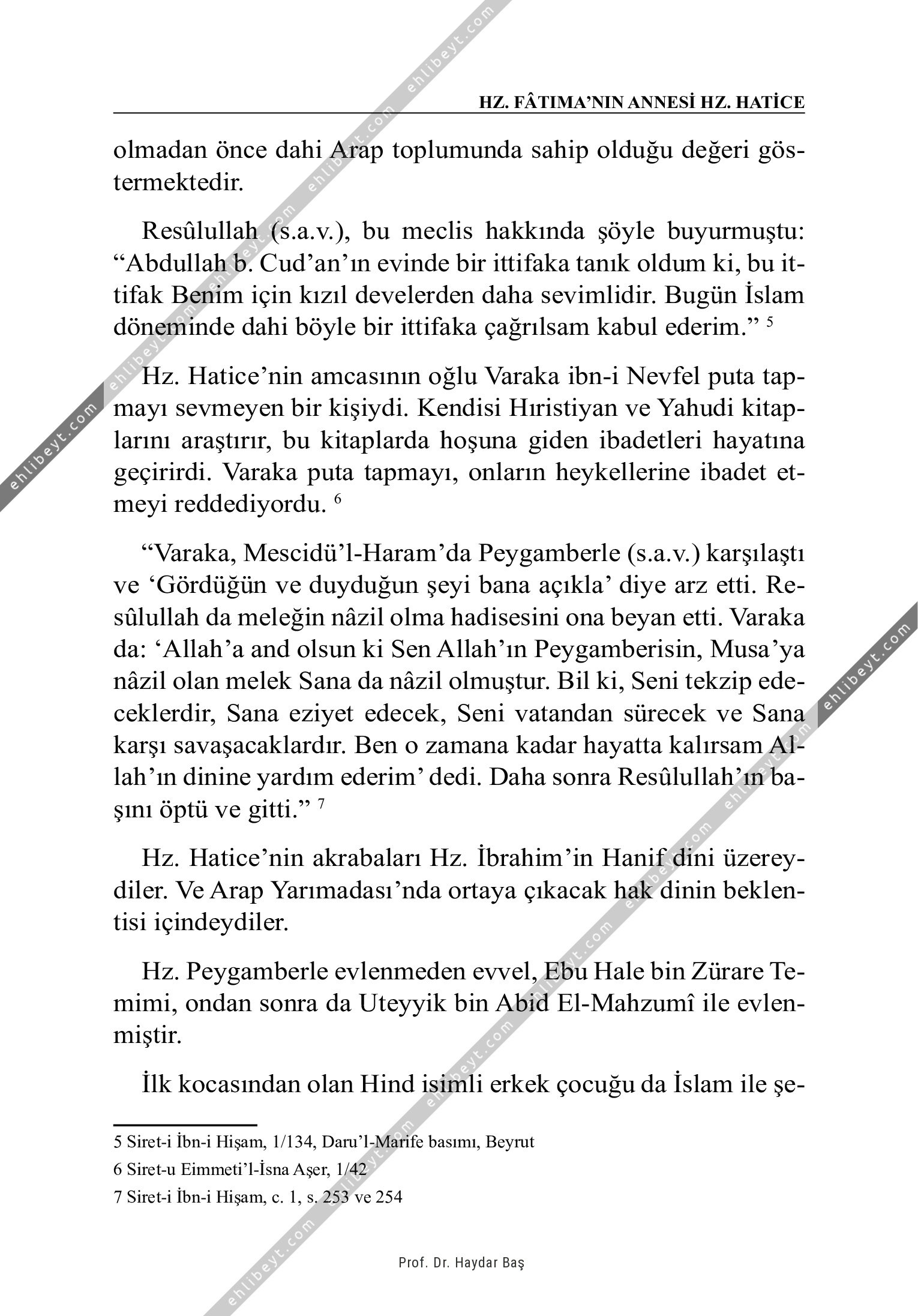 olmadan önce dahi Arap toplumunda sahip olduğu değeri göstermektedir. Resûlullah (s.a.v.), bu meclis hakkında şöyle buyurmuştu: "Abdullah b. Cud'an'ın evinde bir ittifaka tanık oldum ki, bu ittifak Benim için kızıl develerden daha sevimlidir. Bugün İslam döneminde dahi böyle bir ittifaka çağrılsam kabul ederim." 5 Hz. Hatice'nin amcasının oğlu Varaka ibn-i Nevfel puta tapmayı sevmeyen bir kişiydi. Kendisi Hıristiyan ve Yahudi kitaplarını araştırır, bu kitaplarda hoşuna giden ibadetleri hayatına geçirirdi. Varaka puta tapmayı, onların heykellerine ibadet etmeyi reddediyordu. 6 "Varaka, Mescidü'l-Haram'da Peygamberle (s.a.v.) karşılaştı ve `Gördüğün ve duyduğun şeyi bana açıkla' diye arz etti. Resûlullah da meleğin nâzil olma hadisesini ona beyan etti. Varaka da: `Allah'a and olsun ki Sen Allah'ın Peygamberisin, Musa'ya nâzil olan melek Sana da nâzil olmuştur. Bil ki, Seni tekzip edeceklerdir, Sana eziyet edecek, Seni vatandan sürecek ve Sana karşı savaşacaklardır. Ben o zamana kadar hayatta kalırsam Allah'ın dinine […]