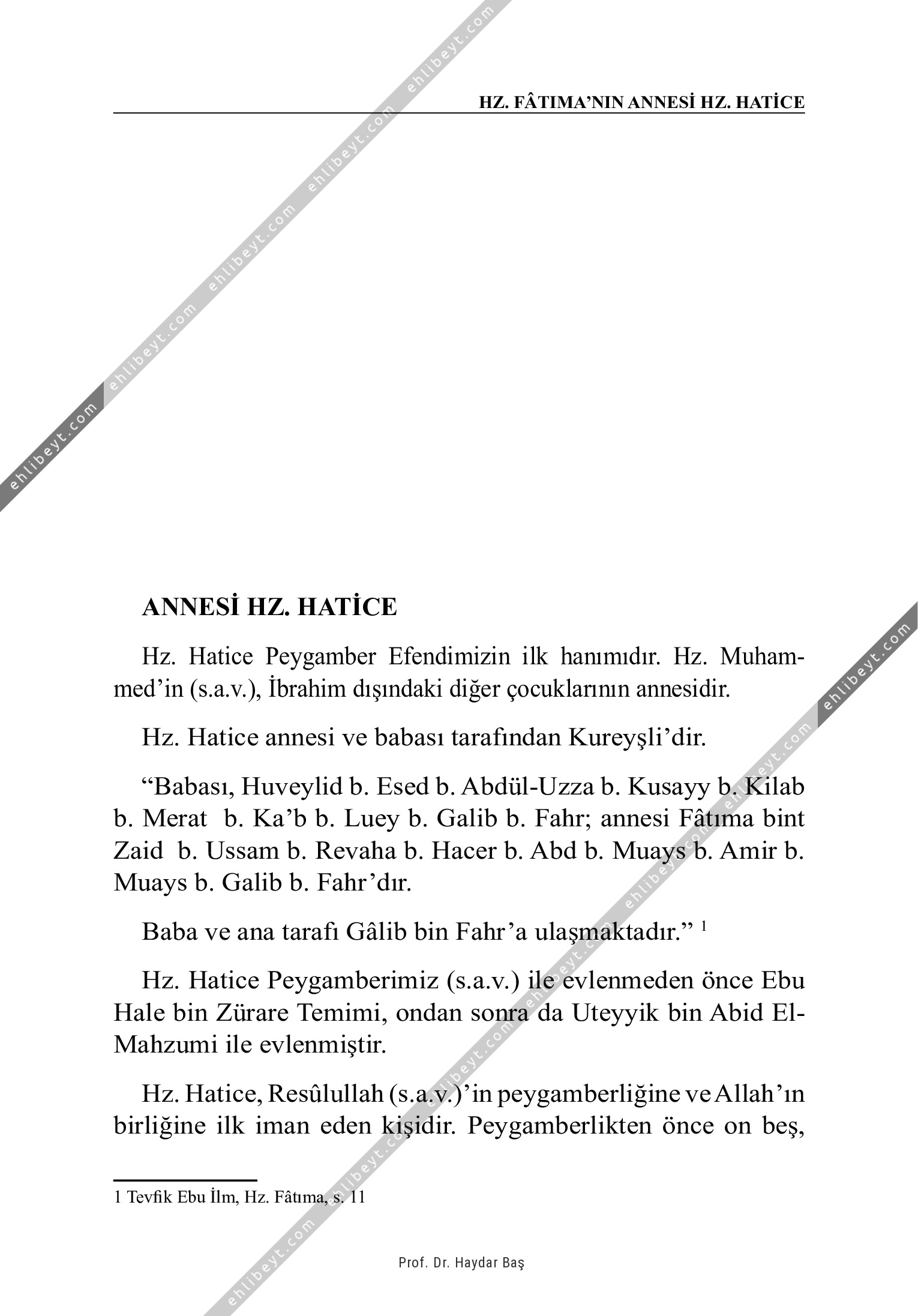 Hz. Hatice Peygamber Efendimizin ilk hanımıdır. Hz. Muhammed'in (s.a.v.), İbrahim dışındaki diğer çocuklarının annesidir. Hz. Hatice annesi ve babası tarafından Kureyşli'dir. "Babası, Huveylid b. Esed b. Abdül-Uzza b. Kusayy b. Kilab b. Merat b. Ka'b b. Luey b. Galib b. Fahr; annesi Fâtıma bint Zaid b. Ussam b. Revaha b. Hacer b. Abd b. Muays b. Amir b. Muays b. Galib b. Fahr'dır. Baba ve ana tarafı Gâlib bin Fahr'a ulaşmaktadır." 1 Hz. Hatice Peygamberimiz (s.a.v.) ile evlenmeden önce Ebu Hale bin Zürare Temimi, ondan sonra da Uteyyik bin Abid ElMahzumi ile evlenmiştir. Hz. Hatice, Resûlullah (s.a.v.)'in peygamberliğine ve Allah'ın birliğine ilk iman eden kişidir. Peygamberlikten önce on beş, 1 Tevfik Ebu İlm, Hz. Fâtıma, s. 11
