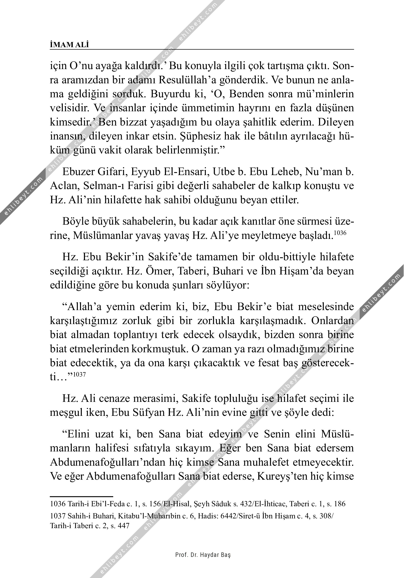 için O'nu ayağa kaldırdı.' Bu konuyla ilgili çok tartışma çıktı. Sonra aramızdan bir adamı Resulüllah'a gönderdik. Ve bunun ne anlama geldiğini sorduk. Buyurdu ki, `O, Benden sonra mü'minlerin velisidir. Ve insanlar içinde ümmetimin hayrını en fazla düşünen kimsedir.' Ben bizzat yaşadığım bu olaya şahitlik ederim. Dileyen inansın, dileyen inkar etsin. Şüphesiz hak ile bâtılın ayrılacağı hüküm günü vakit olarak belirlenmiştir." Ebuzer Gifari, Eyyub El-Ensari, Utbe b. Ebu Leheb, Nu'man b. Aclan, Selman-ı Farisi gibi değerli sahabeler de kalkıp konuştu ve Hz. Ali'nin hilafette hak sahibi olduğunu beyan ettiler. Böyle büyük sahabelerin, bu kadar açık kanıtlar öne sürmesi üzerine, Müslümanlar yavaş yavaş Hz. Ali'ye meyletmeye başladı.1036 Hz. Ebu Bekir'in Sakife'de tamamen bir oldu-bittiyle hilafete seçildiği açıktır. Hz. Ömer, Taberi, Buhari ve İbn Hişam'da beyan edildiğine göre bu konuda şunları söylüyor: "Allah'a yemin ederim ki, biz, Ebu Bekir'e biat meselesinde karşılaştığımız zorluk gibi bir zorlukla karşılaşmadık. Onlardan biat […]