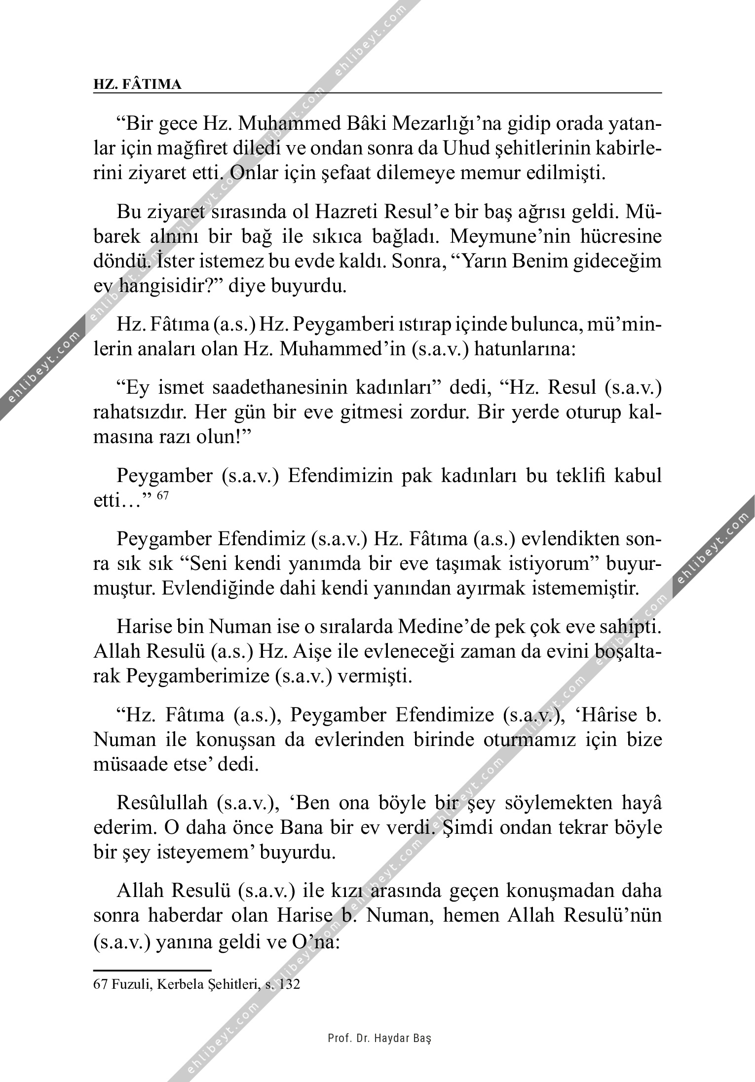 "Bir gece Hz. Muhammed Bâki Mezarlığı'na gidip orada yatanlar için mağfiret diledi ve ondan sonra da Uhud şehitlerinin kabirlerini ziyaret etti. Onlar için şefaat dilemeye memur edilmişti. Bu ziyaret sırasında ol Hazreti Resul'e bir baş ağrısı geldi. Mübarek alnını bir bağ ile sıkıca bağladı. Meymune'nin hücresine döndü. İster istemez bu evde kaldı. Sonra, "Yarın Benim gideceğim ev hangisidir?" diye buyurdu. Hz. Fâtıma (a.s.) Hz. Peygamberi ıstırap içinde bulunca, mü'minlerin anaları olan Hz. Muhammed'in (s.a.v.) hatunlarına: "Ey ismet saadethanesinin kadınları" dedi, "Hz. Resul (s.a.v.) rahatsızdır. Her gün bir eve gitmesi zordur. Bir yerde oturup kalmasına razı olun!" Peygamber (s.a.v.) Efendimizin pak kadınları bu teklifi kabul etti..." 67 Peygamber Efendimiz (s.a.v.) Hz. Fâtıma (a.s.) evlendikten sonra sık sık "Seni kendi yanımda bir eve taşımak istiyorum" buyurmuştur. Evlendiğinde dahi kendi yanından ayırmak istememiştir. Harise bin Numan ise o sıralarda Medine'de pek çok eve sahipti. Allah Resulü […]