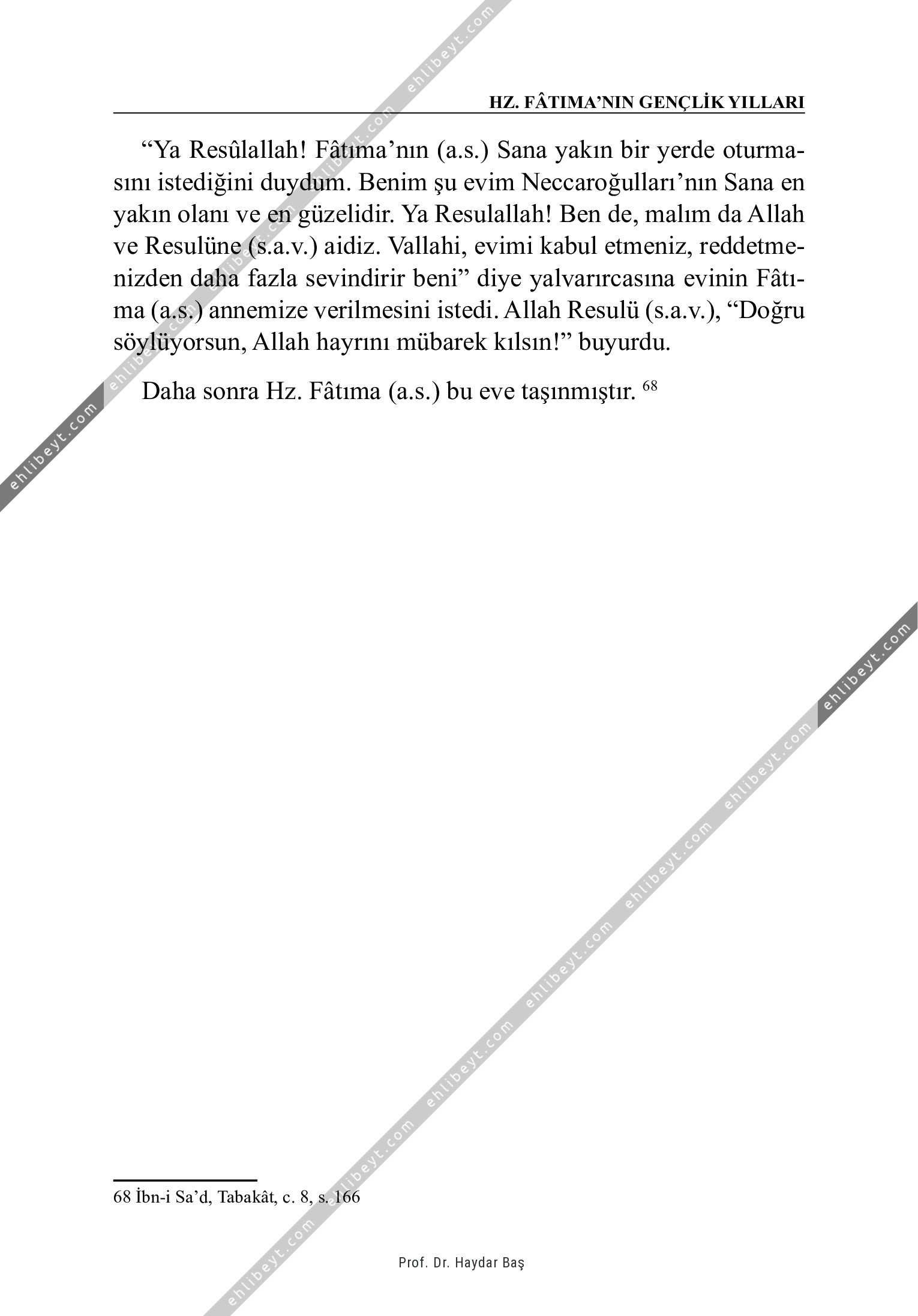 "Ya Resûlallah! Fâtıma'nın (a.s.) Sana yakın bir yerde oturmasını istediğini duydum. Benim şu evim Neccaroğulları'nın Sana en yakın olanı ve en güzelidir. Ya Resulallah! Ben de, malım da Allah ve Resulüne (s.a.v.) aidiz. Vallahi, evimi kabul etmeniz, reddetmenizden daha fazla sevindirir beni" diye yalvarırcasına evinin Fâtıma (a.s.) annemize verilmesini istedi. Allah Resulü (s.a.v.), "Doğru söylüyorsun, Allah hayrını mübarek kılsın!" buyurdu. Daha sonra Hz. Fâtıma (a.s.) bu eve taşınmıştır. 68 68 İbn-i Sa'd, Tabakât, c. 8, s. 166