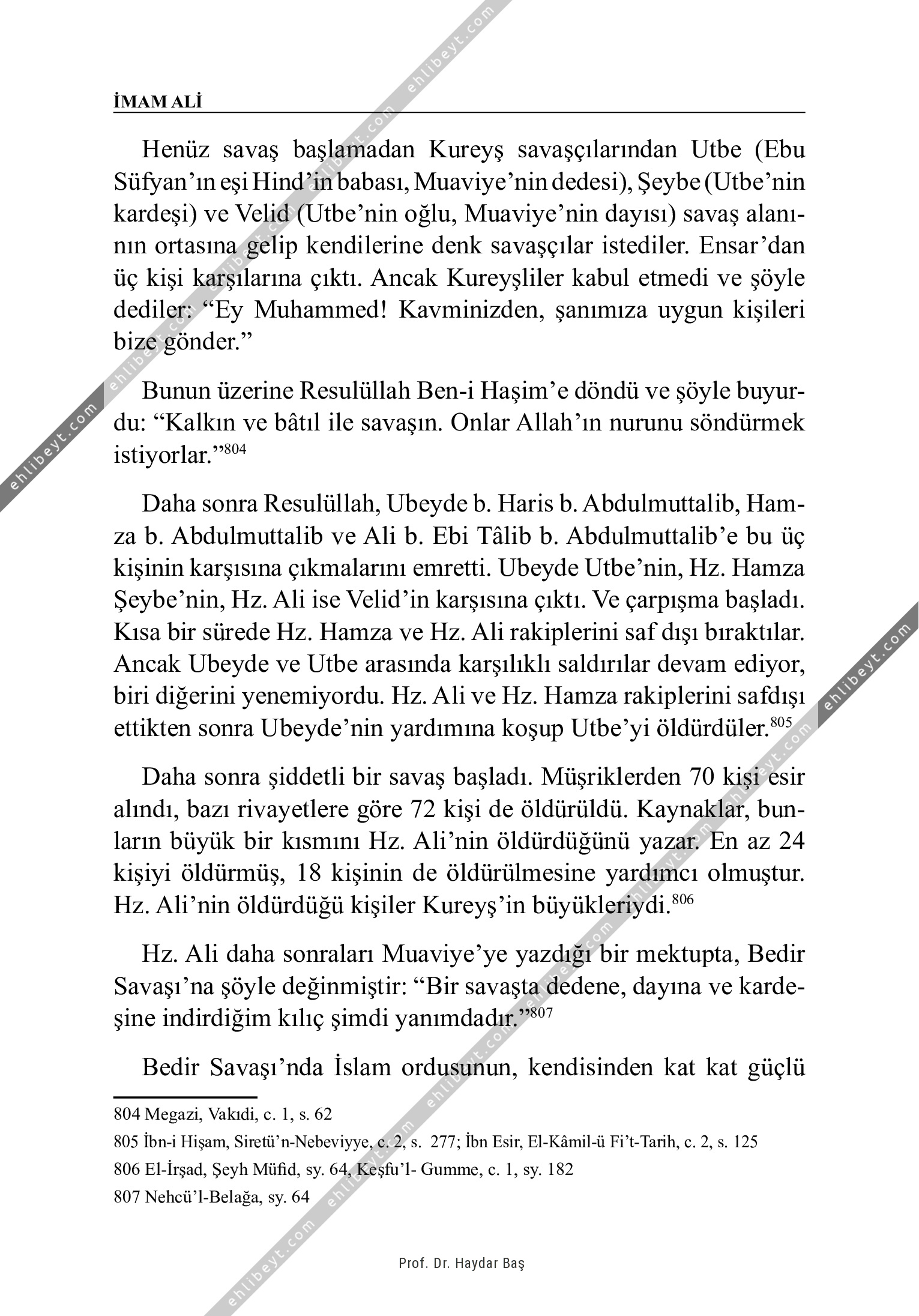 Henüz savaş başlamadan Kureyş savaşçılarından Utbe (Ebu Süfyan'ın eşi Hind'in babası, Muaviye'nin dedesi), Şeybe (Utbe'nin kardeşi) ve Velid (Utbe'nin oğlu, Muaviye'nin dayısı) savaş alanının ortasına gelip kendilerine denk savaşçılar istediler. Ensar'dan üç kişi karşılarına çıktı. Ancak Kureyşliler kabul etmedi ve şöyle dediler: "Ey Muhammed! Kavminizden, şanımıza uygun kişileri bize gönder." Bunun üzerine Resulüllah Ben-i Haşim'e döndü ve şöyle buyurdu: "Kalkın ve bâtıl ile savaşın. Onlar Allah'ın nurunu söndürmek istiyorlar."804 Daha sonra Resulüllah, Ubeyde b. Haris b. Abdulmuttalib, Hamza b. Abdulmuttalib ve Ali b. Ebi Tâlib b. Abdulmuttalib'e bu üç kişinin karşısına çıkmalarını emretti. Ubeyde Utbe'nin, Hz. Hamza Şeybe'nin, Hz. Ali ise Velid'in karşısına çıktı. Ve çarpışma başladı. Kısa bir sürede Hz. Hamza ve Hz. Ali rakiplerini saf dışı bıraktılar. Ancak Ubeyde ve Utbe arasında karşılıklı saldırılar devam ediyor, biri diğerini yenemiyordu. Hz. Ali ve Hz. Hamza rakiplerini safdışı ettikten sonra Ubeyde'nin yardımına koşup Utbe'yi öldürdüler.805 Daha sonra […]