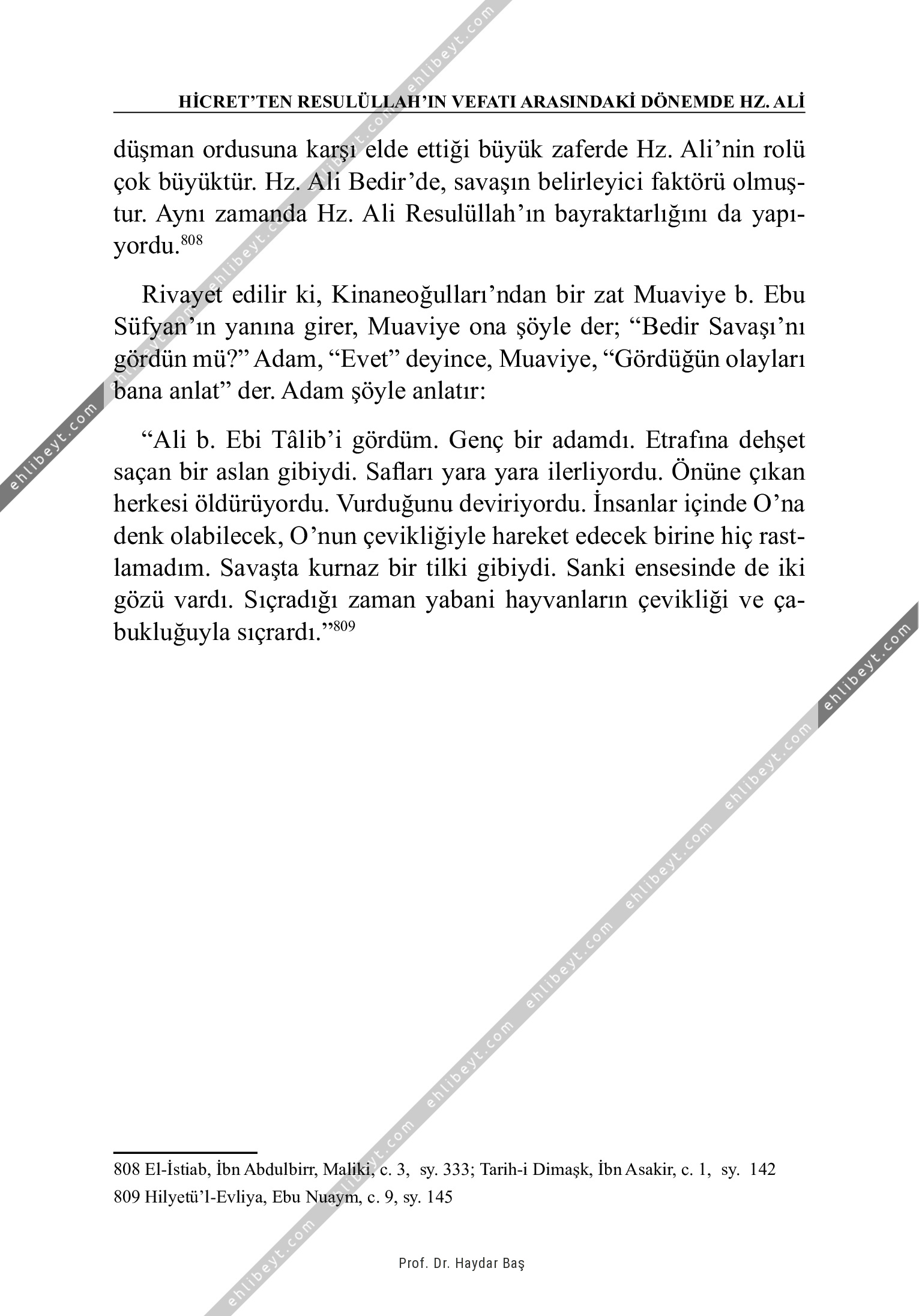 düşman ordusuna karşı elde ettiği büyük zaferde Hz. Ali'nin rolü çok büyüktür. Hz. Ali Bedir'de, savaşın belirleyici faktörü olmuştur. Aynı zamanda Hz. Ali Resulüllah'ın bayraktarlığını da yapıyordu.808 Rivayet edilir ki, Kinaneoğulları'ndan bir zat Muaviye b. Ebu Süfyan'ın yanına girer, Muaviye ona şöyle der; "Bedir Savaşı'nı gördün mü?" Adam, "Evet" deyince, Muaviye, "Gördüğün olayları bana anlat" der. Adam şöyle anlatır: "Ali b. Ebi Tâlib'i gördüm. Genç bir adamdı. Etrafına dehşet saçan bir aslan gibiydi. Safları yara yara ilerliyordu. Önüne çıkan herkesi öldürüyordu. Vurduğunu deviriyordu. İnsanlar içinde O'na denk olabilecek, O'nun çevikliğiyle hareket edecek birine hiç rastlamadım. Savaşta kurnaz bir tilki gibiydi. Sanki ensesinde de iki gözü vardı. Sıçradığı zaman yabani hayvanların çevikliği ve çabukluğuyla sıçrardı."809   808 El-İstiab, İbn Abdulbirr, Maliki, c. 3, sy. 333; Tarih-i Dimaşk, İbn Asakir, c. 1, sy. 142 809 Hilyetü'l-Evliya, Ebu Nuaym, c. 9, sy. 145