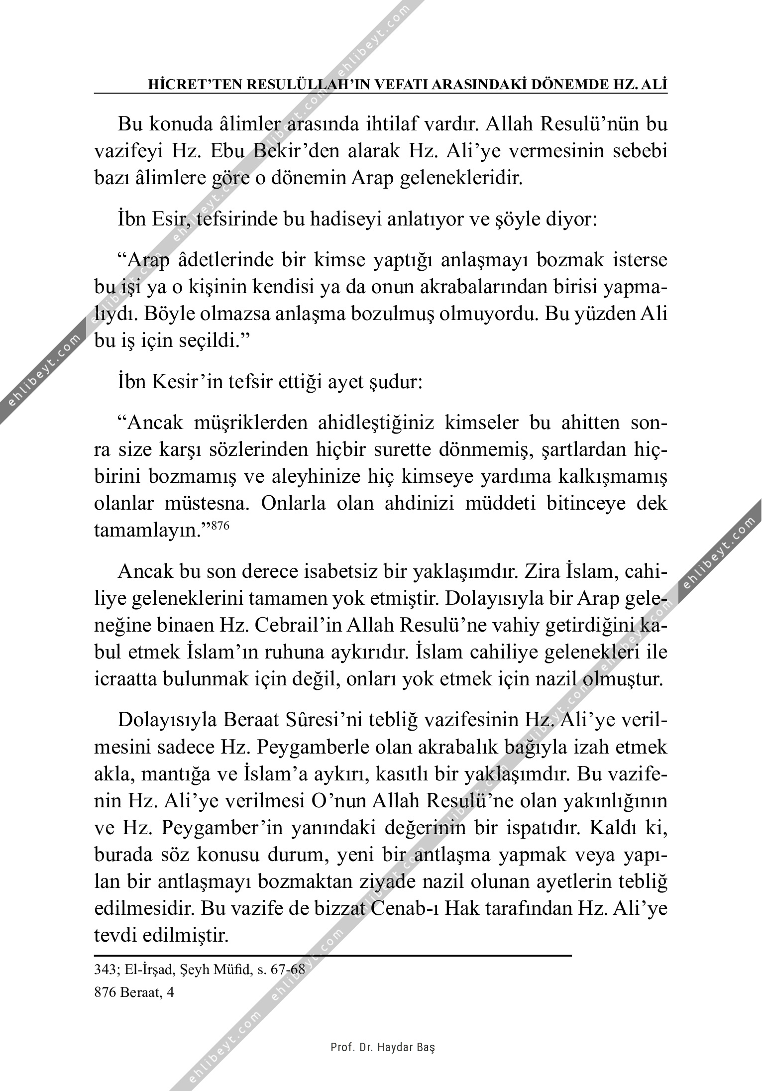 Bu konuda âlimler arasında ihtilaf vardır. Allah Resulü'nün bu vazifeyi Hz. Ebu Bekir'den alarak Hz. Ali'ye vermesinin sebebi bazı âlimlere göre o dönemin Arap gelenekleridir. İbn Esir, tefsirinde bu hadiseyi anlatıyor ve şöyle diyor: "Arap âdetlerinde bir kimse yaptığı anlaşmayı bozmak isterse bu işi ya o kişinin kendisi ya da onun akrabalarından birisi yapmalıydı. Böyle olmazsa anlaşma bozulmuş olmuyordu. Bu yüzden Ali bu iş için seçildi." İbn Kesir'in tefsir ettiği ayet şudur: "Ancak müşriklerden ahidleştiğiniz kimseler bu ahitten sonra size karşı sözlerinden hiçbir surette dönmemiş, şartlardan hiçbirini bozmamış ve aleyhinize hiç kimseye yardıma kalkışmamış olanlar müstesna. Onlarla olan ahdinizi müddeti bitinceye dek tamamlayın."876 Ancak bu son derece isabetsiz bir yaklaşımdır. Zira İslam, cahiliye geleneklerini tamamen yok etmiştir. Dolayısıyla bir Arap geleneğine binaen Hz. Cebrail'in Allah Resulü'ne vahiy getirdiğini kabul etmek İslam'ın ruhuna aykırıdır. İslam cahiliye gelenekleri ile icraatta bulunmak için değil, onları yok etmek […]