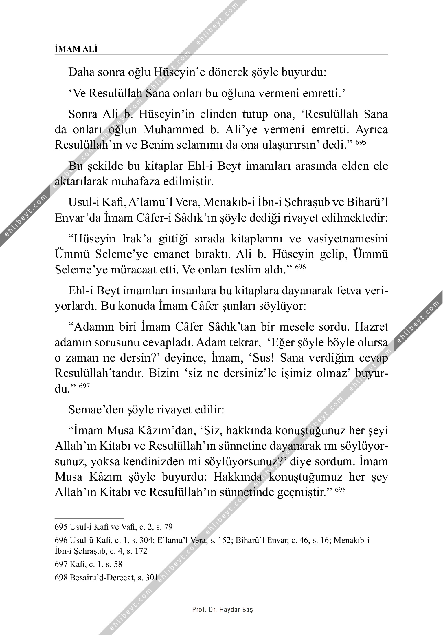 Daha sonra oğlu Hüseyin'e dönerek şöyle buyurdu: `Ve Resulüllah Sana onları bu oğluna vermeni emretti.' Sonra Ali b. Hüseyin'in elinden tutup ona, `Resulüllah Sana da onları oğlun Muhammed b. Ali'ye vermeni emretti. Ayrıca Resulüllah'ın ve Benim selamımı da ona ulaştırırsın' dedi." 695 Bu şekilde bu kitaplar Ehl-i Beyt imamları arasında elden ele aktarılarak muhafaza edilmiştir. Usul-i Kafi, A'lamu'l Vera, Menakıb-i İbn-i Şehraşub ve Biharü'l Envar'da İmam Câfer-i Sâdık'ın şöyle dediği rivayet edilmektedir: "Hüseyin Irak'a gittiği sırada kitaplarını ve vasiyetnamesini Ümmü Seleme'ye emanet bıraktı. Ali b. Hüseyin gelip, Ümmü Seleme'ye müracaat etti. Ve onları teslim aldı." 696 Ehl-i Beyt imamları insanlara bu kitaplara dayanarak fetva veriyorlardı. Bu konuda İmam Câfer şunları söylüyor: "Adamın biri İmam Câfer Sâdık'tan bir mesele sordu. Hazret adamın sorusunu cevapladı. Adam tekrar, `Eğer şöyle böyle olursa o zaman ne dersin?' deyince, İmam, `Sus! Sana verdiğim cevap Resulüllah'tandır. Bizim `siz ne dersiniz'le işimiz olmaz' buyurdu." 697 […]