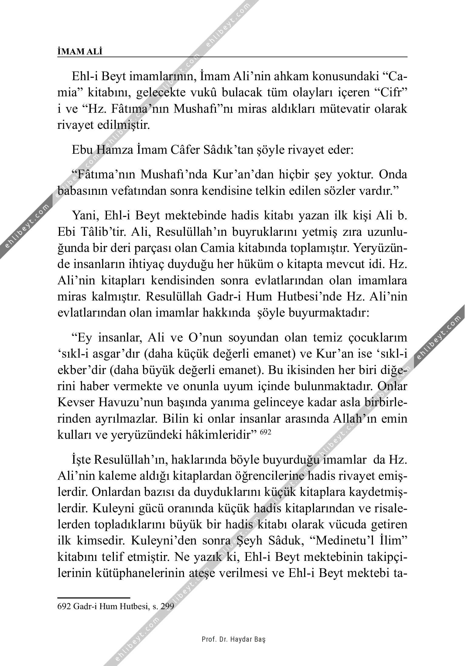 Ehl-i Beyt imamlarının, İmam Ali'nin ahkam konusundaki "Camia" kitabını, gelecekte vukû bulacak tüm olayları içeren "Cifr" i ve "Hz. Fâtıma'nın Mushafı"nı miras aldıkları mütevatir olarak rivayet edilmiştir. Ebu Hamza İmam Câfer Sâdık'tan şöyle rivayet eder: "Fâtıma'nın Mushafı'nda Kur'an'dan hiçbir şey yoktur. Onda babasının vefatından sonra kendisine telkin edilen sözler vardır." Yani, Ehl-i Beyt mektebinde hadis kitabı yazan ilk kişi Ali b. Ebi Tâlib'tir. Ali, Resulüllah'ın buyruklarını yetmiş zıra uzunluğunda bir deri parçası olan Camia kitabında toplamıştır. Yeryüzünde insanların ihtiyaç duyduğu her hüküm o kitapta mevcut idi. Hz. Ali'nin kitapları kendisinden sonra evlatlarından olan imamlara miras kalmıştır. Resulüllah Gadr-i Hum Hutbesi'nde Hz. Ali'nin evlatlarından olan imamlar hakkında şöyle buyurmaktadır: "Ey insanlar, Ali ve O'nun soyundan olan temiz çocuklarım `sıkl-i asgar'dır (daha küçük değerli emanet) ve Kur'an ise `sıkl-i ekber'dir (daha büyük değerli emanet). Bu ikisinden her biri diğerini haber vermekte ve onunla uyum içinde bulunmaktadır. Onlar Kevser […]