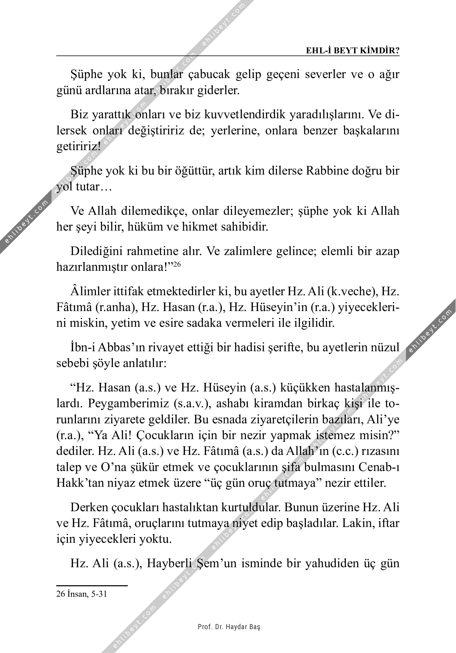 Şüphe yok ki, bunlar çabucak gelip geçeni severler ve o ağır günü ardlarına atar, bırakır giderler. Biz yarattık onları ve biz kuvvetlendirdik yaradılışlarını. Ve dilersek onları değiştiririz de; yerlerine, onlara benzer başkalarını getiririz! Şüphe yok ki bu bir öğüttür, artık kim dilerse Rabbine doğru bir yol tutar... Ve Allah dilemedikçe, onlar dileyemezler; şüphe yok ki Allah her şeyi bilir, hüküm ve hikmet sahibidir. Dilediğini rahmetine alır. Ve zalimlere gelince; elemli bir azap hazırlanmıştır onlara!"26 Âlimler ittifak etmektedirler ki, bu ayetler Hz. Ali (k.veche), Hz. Fâtımâ (r.anha), Hz. Hasan (r.a.), Hz. Hüseyin'in (r.a.) yiyeceklerini miskin, yetim ve esire sadaka vermeleri ile ilgilidir. İbn-i Abbas'ın rivayet ettiği bir hadisi şerifte, bu ayetlerin nüzul sebebi şöyle anlatılır: "Hz. Hasan (a.s.) ve Hz. Hüseyin (a.s.) küçükken hastalanmışlardı. Peygamberimiz (s.a.v.), ashabı kiramdan birkaç kişi ile torunlarını ziyarete geldiler. Bu esnada ziyaretçilerin bazıları, Ali'ye (r.a.), "Ya Ali! Çocukların için bir nezir yapmak […]