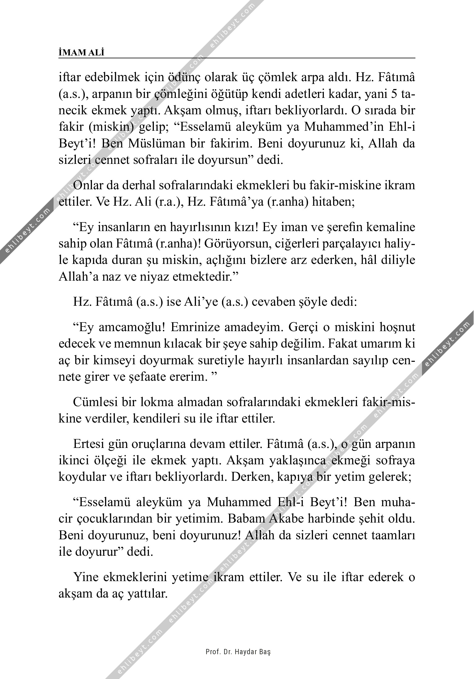 iftar edebilmek için ödünç olarak üç çömlek arpa aldı. Hz. Fâtımâ (a.s.), arpanın bir çömleğini öğütüp kendi adetleri kadar, yani 5 tanecik ekmek yaptı. Akşam olmuş, iftarı bekliyorlardı. O sırada bir fakir (miskin) gelip; "Esselamü aleyküm ya Muhammed'in Ehl-i Beyt'i! Ben Müslüman bir fakirim. Beni doyurunuz ki, Allah da sizleri cennet sofraları ile doyursun" dedi. Onlar da derhal sofralarındaki ekmekleri bu fakir-miskine ikram ettiler. Ve Hz. Ali (r.a.), Hz. Fâtımâ'ya (r.anha) hitaben; "Ey insanların en hayırlısının kızı! Ey iman ve şerefin kemaline sahip olan Fâtımâ (r.anha)! Görüyorsun, ciğerleri parçalayıcı haliyle kapıda duran şu miskin, açlığını bizlere arz ederken, hâl diliyle Allah'a naz ve niyaz etmektedir." Hz. Fâtımâ (a.s.) ise Ali'ye (a.s.) cevaben şöyle dedi: "Ey amcamoğlu! Emrinize amadeyim. Gerçi o miskini hoşnut edecek ve memnun kılacak bir şeye sahip değilim. Fakat umarım ki aç bir kimseyi doyurmak suretiyle hayırlı insanlardan sayılıp cennete girer ve şefaate ererim. " […]