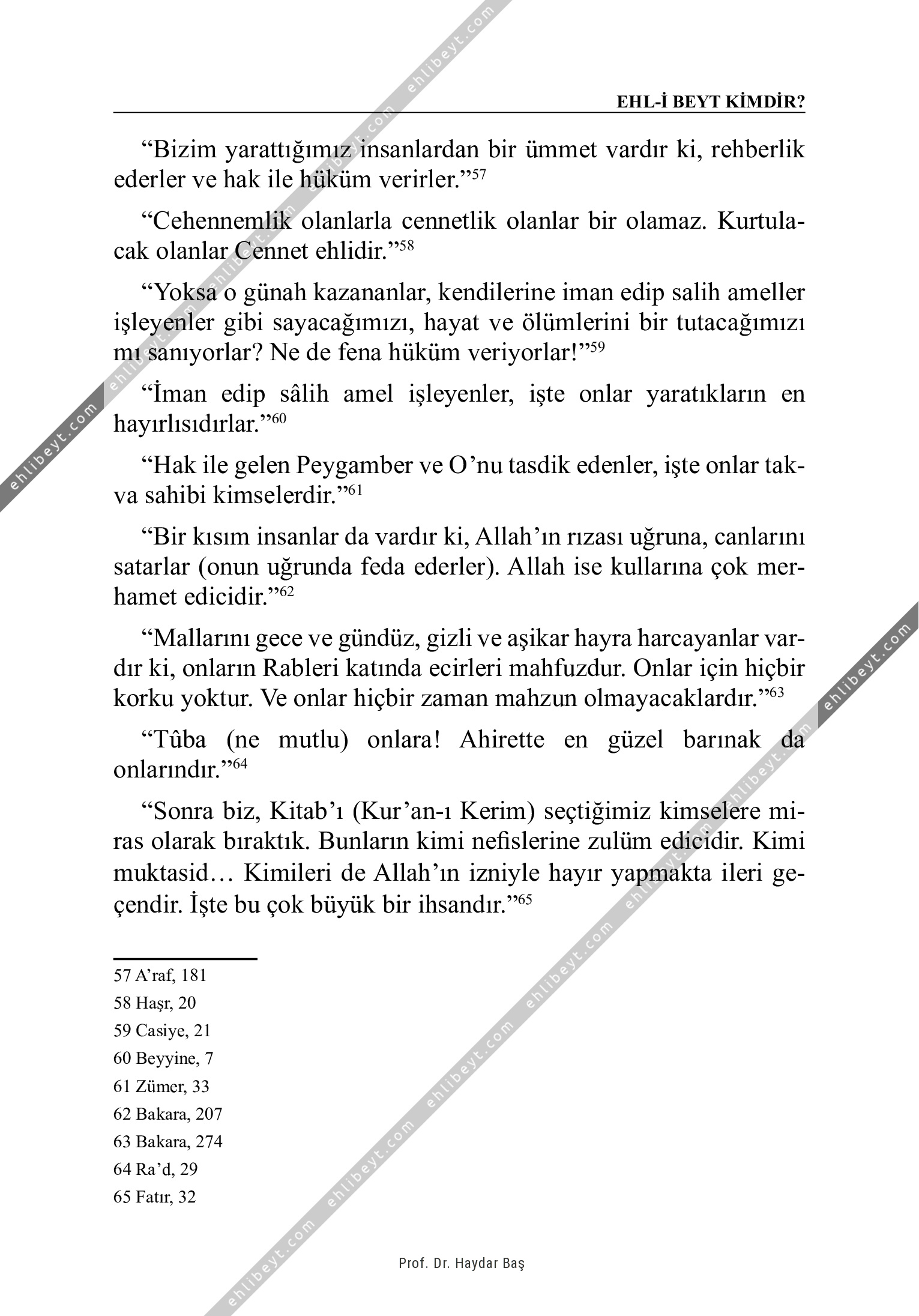 "Bizim yarattığımız insanlardan bir ümmet vardır ki, rehberlik ederler ve hak ile hüküm verirler."57 "Cehennemlik olanlarla cennetlik olanlar bir olamaz. Kurtulacak olanlar Cennet ehlidir."58 "Yoksa o günah kazananlar, kendilerine iman edip salih ameller işleyenler gibi sayacağımızı, hayat ve ölümlerini bir tutacağımızı mı sanıyorlar? Ne de fena hüküm veriyorlar!"59 "İman edip sâlih amel işleyenler, işte onlar yaratıkların en hayırlısıdırlar."60 "Hak ile gelen Peygamber ve O'nu tasdik edenler, işte onlar takva sahibi kimselerdir."61 "Bir kısım insanlar da vardır ki, Allah'ın rızası uğruna, canlarını satarlar (onun uğrunda feda ederler). Allah ise kullarına çok merhamet edicidir."62 "Mallarını gece ve gündüz, gizli ve aşikar hayra harcayanlar vardır ki, onların Rableri katında ecirleri mahfuzdur. Onlar için hiçbir korku yoktur. Ve onlar hiçbir zaman mahzun olmayacaklardır."63 "Tûba (ne mutlu) onlara! Ahirette en güzel barınak da onlarındır."64 "Sonra biz, Kitab'ı (Kur'an-ı Kerim) seçtiğimiz kimselere miras olarak bıraktık. Bunların kimi nefislerine zulüm edicidir. Kimi […]