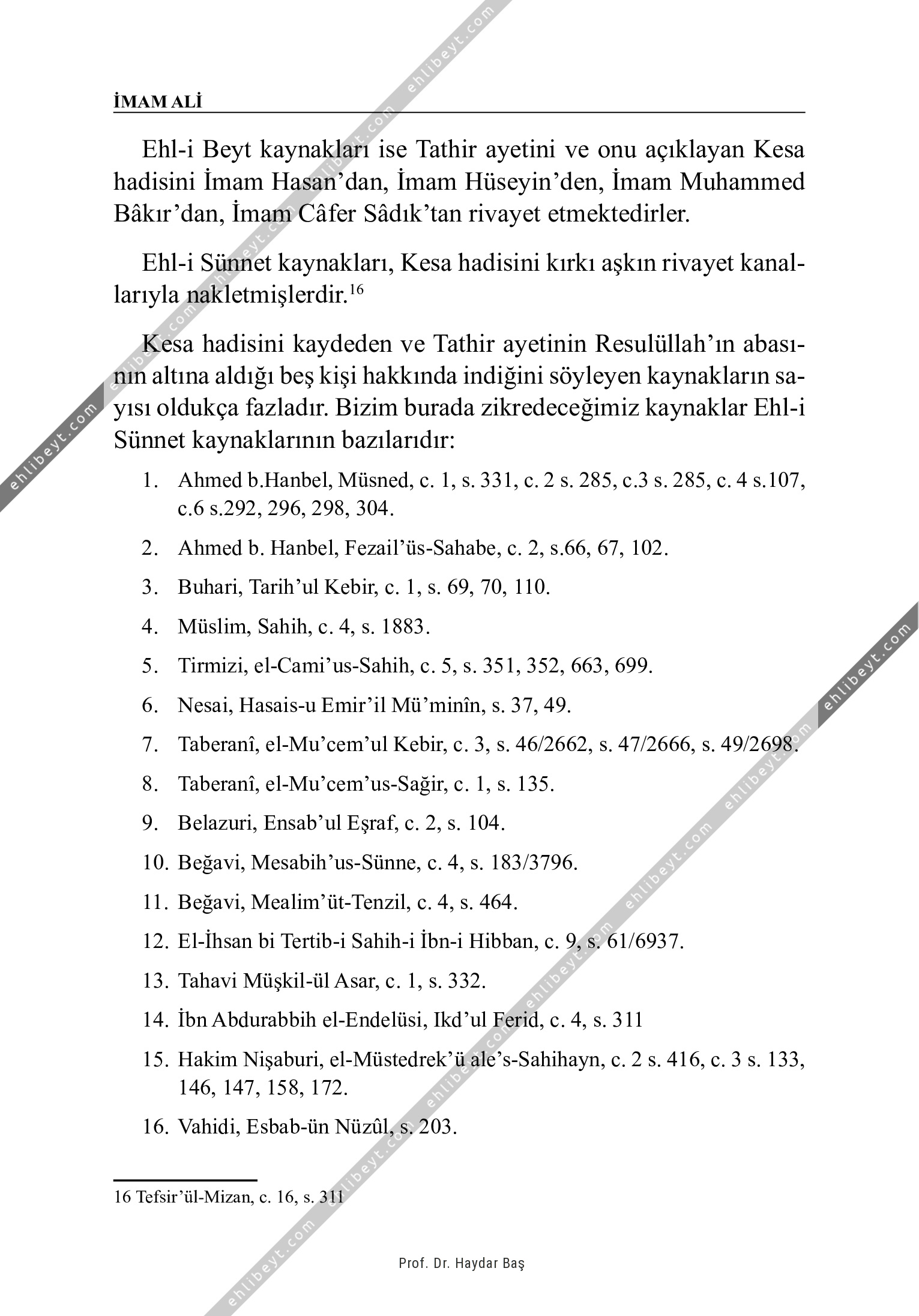 Ehl-i Beyt kaynakları ise Tathir ayetini ve onu açıklayan Kesa hadisini İmam Hasan'dan, İmam Hüseyin'den, İmam Muhammed Bâkır'dan, İmam Câfer Sâdık'tan rivayet etmektedirler. Ehl-i Sünnet kaynakları, Kesa hadisini kırkı aşkın rivayet kanallarıyla nakletmişlerdir.16 Kesa hadisini kaydeden ve Tathir ayetinin Resulüllah'ın abasının altına aldığı beş kişi hakkında indiğini söyleyen kaynakların sayısı oldukça fazladır. Bizim burada zikredeceğimiz kaynaklar Ehl-i Sünnet kaynaklarının bazılarıdır: 1. Ahmed b.Hanbel, Müsned, c. 1, s. 331, c. 2 s. 285, c.3 s. 285, c. 4 s.107, c.6 s.292, 296, 298, 304. 2. Ahmed b. Hanbel, Fezail'üs-Sahabe, c. 2, s.66, 67, 102. 3. Buhari, Tarih'ul Kebir, c. 1, s. 69, 70, 110. 4. Müslim, Sahih, c. 4, s. 1883. 5. Tirmizi, el-Cami'us-Sahih, c. 5, s. 351, 352, 663, 699. 6. Nesai, Hasais-u Emir'il Mü'minîn, s. 37, 49. 7. Taberanî, el-Mu'cem'ul Kebir, c. 3, s. 46/2662, s. 47/2666, s. 49/2698. 8. Taberanî, el-Mu'cem'us-Sağir, c. 1, s. 135. […]