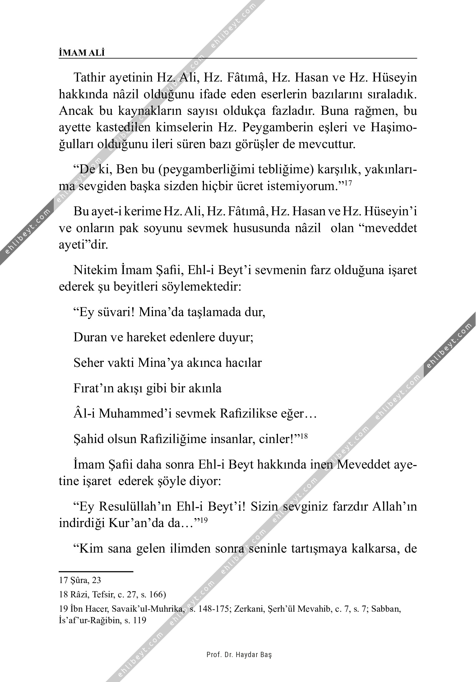 Tathir ayetinin Hz. Ali, Hz. Fâtımâ, Hz. Hasan ve Hz. Hüseyin hakkında nâzil olduğunu ifade eden eserlerin bazılarını sıraladık. Ancak bu kaynakların sayısı oldukça fazladır. Buna rağmen, bu ayette kastedilen kimselerin Hz. Peygamberin eşleri ve Haşimoğulları olduğunu ileri süren bazı görüşler de mevcuttur. "De ki, Ben bu (peygamberliğimi tebliğime) karşılık, yakınlarıma sevgiden başka sizden hiçbir ücret istemiyorum."17 Bu ayet-i kerime Hz. Ali, Hz. Fâtımâ, Hz. Hasan ve Hz. Hüseyin'i ve onların pak soyunu sevmek hususunda nâzil olan "meveddet ayeti"dir. Nitekim İmam Şafii, Ehl-i Beyt'i sevmenin farz olduğuna işaret ederek şu beyitleri söylemektedir: "Ey süvari! Mina'da taşlamada dur, Duran ve hareket edenlere duyur; Seher vakti Mina'ya akınca hacılar Fırat'ın akışı gibi bir akınla Âl-i Muhammed'i sevmek Rafizilikse eğer... Şahid olsun Rafiziliğime insanlar, cinler!"18 İmam Şafii daha sonra Ehl-i Beyt hakkında inen Meveddet ayetine işaret ederek şöyle diyor: "Ey Resulüllah'ın Ehl-i Beyt'i! Sizin sevginiz farzdır Allah'ın indirdiği Kur'an'da da..."19 […]