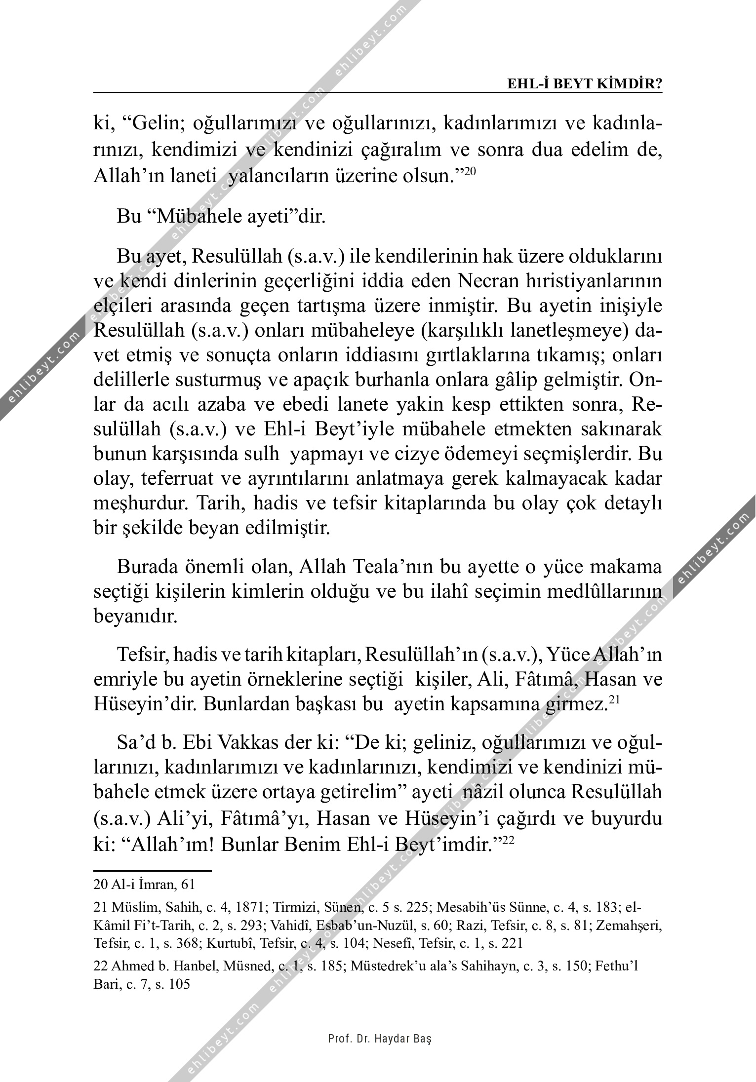 ki, "Gelin; oğullarımızı ve oğullarınızı, kadınlarımızı ve kadınlarınızı, kendimizi ve kendinizi çağıralım ve sonra dua edelim de, Allah'ın laneti yalancıların üzerine olsun."20 Bu "Mübahele ayeti"dir. Bu ayet, Resulüllah (s.a.v.) ile kendilerinin hak üzere olduklarını ve kendi dinlerinin geçerliğini iddia eden Necran hıristiyanlarının elçileri arasında geçen tartışma üzere inmiştir. Bu ayetin inişiyle Resulüllah (s.a.v.) onları mübaheleye (karşılıklı lanetleşmeye) davet etmiş ve sonuçta onların iddiasını gırtlaklarına tıkamış; onları delillerle susturmuş ve apaçık burhanla onlara gâlip gelmiştir. Onlar da acılı azaba ve ebedi lanete yakin kesp ettikten sonra, Resulüllah (s.a.v.) ve Ehl-i Beyt'iyle mübahele etmekten sakınarak bunun karşısında sulh yapmayı ve cizye ödemeyi seçmişlerdir. Bu olay, teferruat ve ayrıntılarını anlatmaya gerek kalmayacak kadar meşhurdur. Tarih, hadis ve tefsir kitaplarında bu olay çok detaylı bir şekilde beyan edilmiştir. Burada önemli olan, Allah Teala'nın bu ayette o yüce makama seçtiği kişilerin kimlerin olduğu ve bu ilahî seçimin medlûllarının beyanıdır. Tefsir, hadis […]