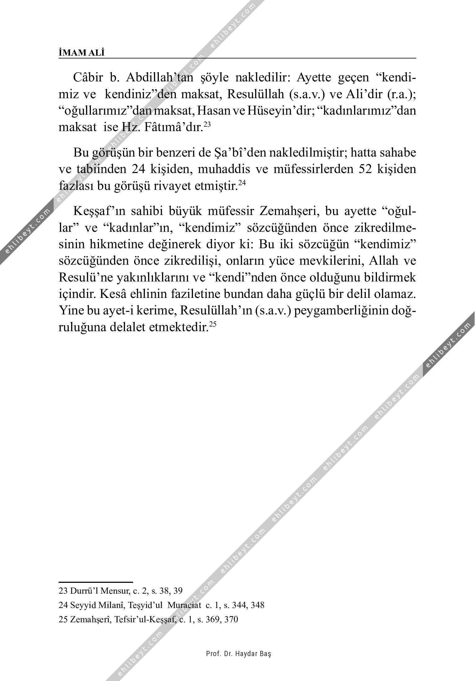 Câbir b. Abdillah'tan şöyle nakledilir: Ayette geçen "kendimiz ve kendiniz"den maksat, Resulüllah (s.a.v.) ve Ali'dir (r.a.); "oğullarımız"dan maksat, Hasan ve Hüseyin'dir; "kadınlarımız"dan maksat ise Hz. Fâtımâ'dır.23 Bu görüşün bir benzeri de Şa'bî'den nakledilmiştir; hatta sahabe ve tabiinden 24 kişiden, muhaddis ve müfessirlerden 52 kişiden fazlası bu görüşü rivayet etmiştir.24 Keşşaf'ın sahibi büyük müfessir Zemahşeri, bu ayette "oğullar" ve "kadınlar"ın, "kendimiz" sözcüğünden önce zikredilmesinin hikmetine değinerek diyor ki: Bu iki sözcüğün "kendimiz" sözcüğünden önce zikredilişi, onların yüce mevkilerini, Allah ve Resulü'ne yakınlıklarını ve "kendi"nden önce olduğunu bildirmek içindir. Kesâ ehlinin faziletine bundan daha güçlü bir delil olamaz. Yine bu ayet-i kerime, Resulüllah'ın (s.a.v.) peygamberliğinin doğruluğuna delalet etmektedir.25 23 Durrü'l Mensur, c. 2, s. 38, 39 24 Seyyid Milanî, Teşyid'ul Muraciat c. 1, s. 344, 348 25 Zemahşerî, Tefsir'ul-Keşşaf, c. 1, s. 369, 370