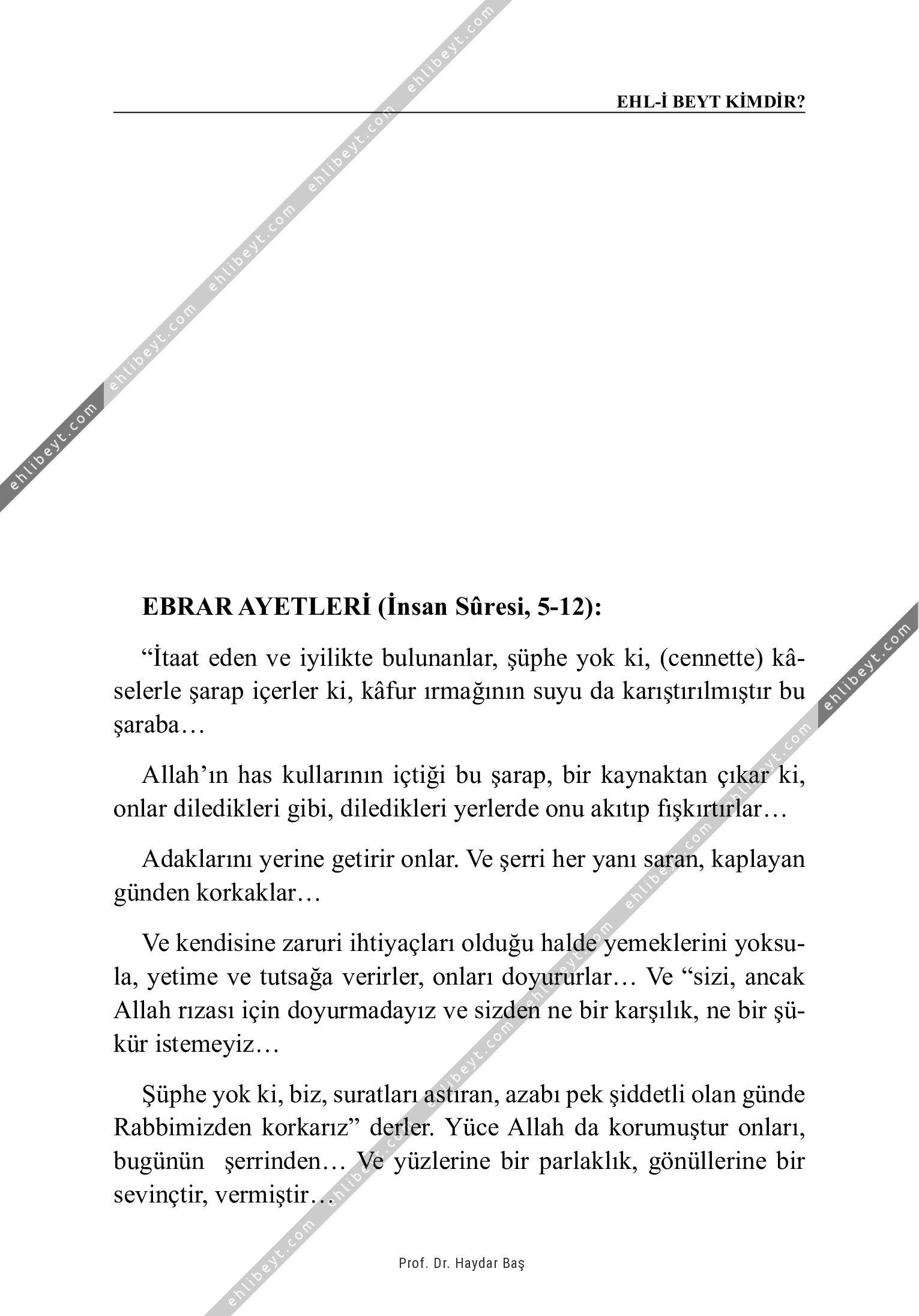 EBRAR AYETLERİ (İnsan Sûresi, 5-12): "İtaat eden ve iyilikte bulunanlar, şüphe yok ki, (cennette) kâselerle şarap içerler ki, kâfur ırmağının suyu da karıştırılmıştır bu şaraba... Allah'ın has kullarının içtiği bu şarap, bir kaynaktan çıkar ki, onlar diledikleri gibi, diledikleri yerlerde onu akıtıp fışkırtırlar... Adaklarını yerine getirir onlar. Ve şerri her yanı saran, kaplayan günden korkaklar... Ve kendisine zaruri ihtiyaçları olduğu halde yemeklerini yoksula, yetime ve tutsağa verirler, onları doyururlar... Ve "sizi, ancak Allah rızası için doyurmadayız ve sizden ne bir karşılık, ne bir şükür istemeyiz... Şüphe yok ki, biz, suratları astıran, azabı pek şiddetli olan günde Rabbimizden korkarız" derler. Yüce Allah da korumuştur onları, bugünün şerrinden... Ve yüzlerine bir parlaklık, gönüllerine bir sevinçtir, vermiştir...