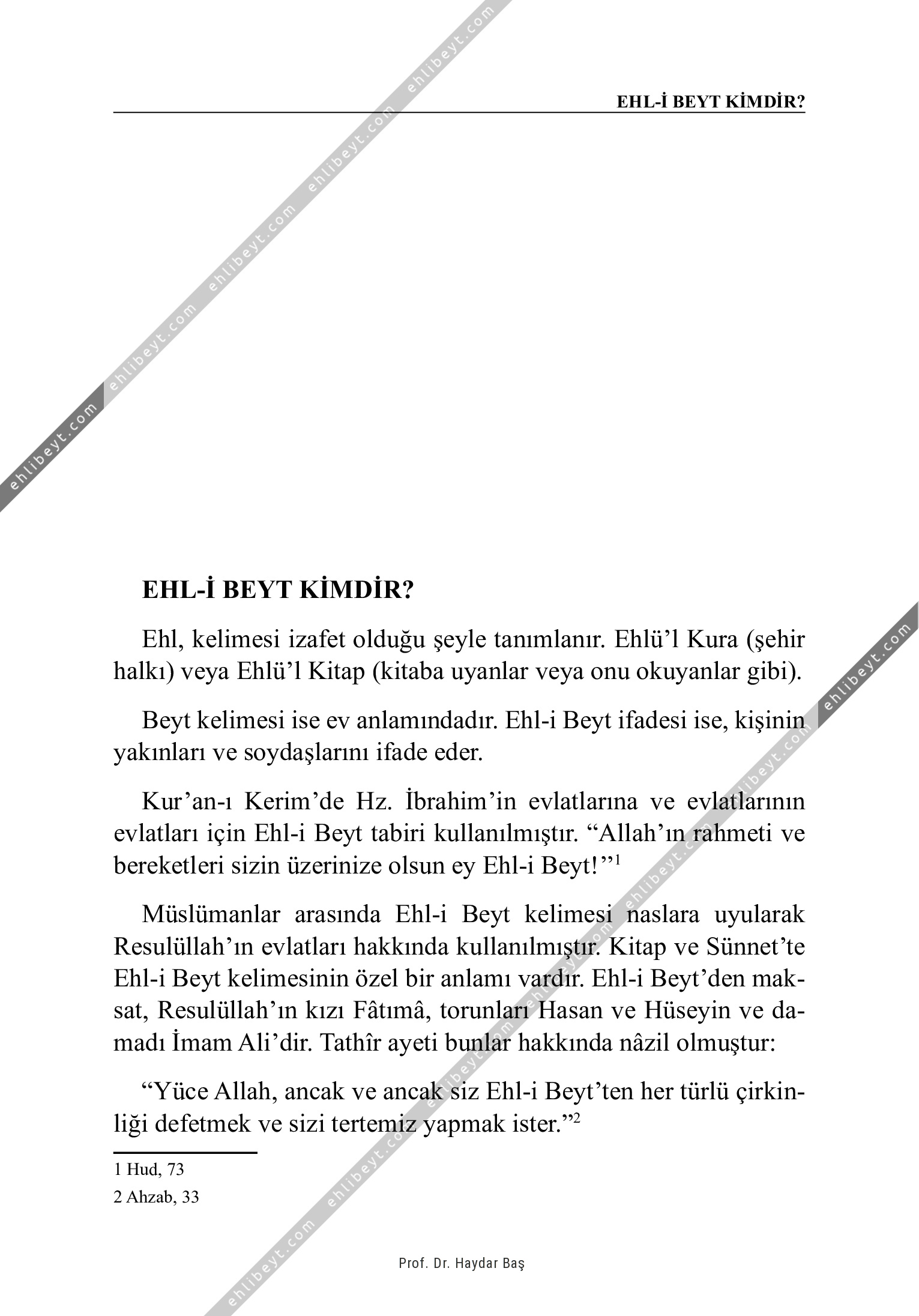 Ehl, kelimesi izafet olduğu şeyle tanımlanır. Ehlü'l Kura (şehir halkı) veya Ehlü'l Kitap (kitaba uyanlar veya onu okuyanlar gibi). Beyt kelimesi ise ev anlamındadır. Ehl-i Beyt ifadesi ise, kişinin yakınları ve soydaşlarını ifade eder. Kur'an-ı Kerim'de Hz. İbrahim'in evlatlarına ve evlatlarının evlatları için Ehl-i Beyt tabiri kullanılmıştır. "Allah'ın rahmeti ve bereketleri sizin üzerinize olsun ey Ehl-i Beyt!''1 Müslümanlar arasında Ehl-i Beyt kelimesi naslara uyularak Resulüllah'ın evlatları hakkında kullanılmıştır. Kitap ve Sünnet'te Ehl-i Beyt kelimesinin özel bir anlamı vardır. Ehl-i Beyt'den maksat, Resulüllah'ın kızı Fâtımâ, torunları Hasan ve Hüseyin ve damadı İmam Ali'dir. Tathîr ayeti bunlar hakkında nâzil olmuştur: "Yüce Allah, ancak ve ancak siz Ehl-i Beyt'ten her türlü çirkinliği defetmek ve sizi tertemiz yapmak ister."2 1 Hud, 73 2 Ahzab, 33