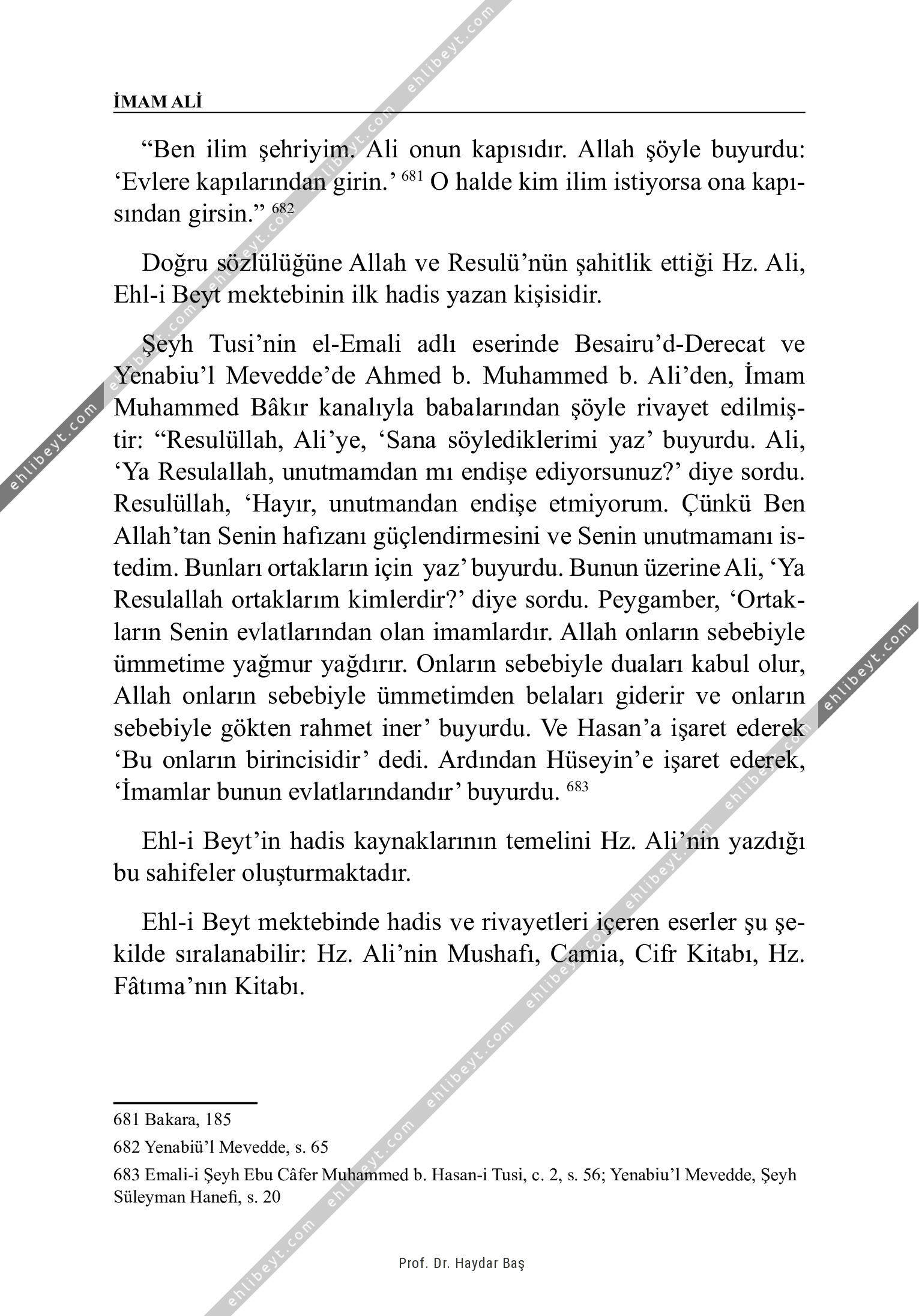 "Ben ilim şehriyim. Ali onun kapısıdır. Allah şöyle buyurdu: `Evlere kapılarından girin.' 681 O halde kim ilim istiyorsa ona kapısından girsin." 682 Doğru sözlülüğüne Allah ve Resulü'nün şahitlik ettiği Hz. Ali, Ehl-i Beyt mektebinin ilk hadis yazan kişisidir. Şeyh Tusi'nin el-Emali adlı eserinde Besairu'd-Derecat ve Yenabiu'l Mevedde'de Ahmed b. Muhammed b. Ali'den, İmam Muhammed Bâkır kanalıyla babalarından şöyle rivayet edilmiştir: "Resulüllah, Ali'ye, `Sana söylediklerimi yaz' buyurdu. Ali, `Ya Resulallah, unutmamdan mı endişe ediyorsunuz?' diye sordu. Resulüllah, `Hayır, unutmandan endişe etmiyorum. Çünkü Ben Allah'tan Senin hafızanı güçlendirmesini ve Senin unutmamanı istedim. Bunları ortakların için yaz' buyurdu. Bunun üzerine Ali, `Ya Resulallah ortaklarım kimlerdir?' diye sordu. Peygamber, `Ortakların Senin evlatlarından olan imamlardır. Allah onların sebebiyle ümmetime yağmur yağdırır. Onların sebebiyle duaları kabul olur, Allah onların sebebiyle ümmetimden belaları giderir ve onların sebebiyle gökten rahmet iner' buyurdu. Ve Hasan'a işaret ederek `Bu onların birincisidir' dedi. Ardından Hüseyin'e işaret ederek, […]