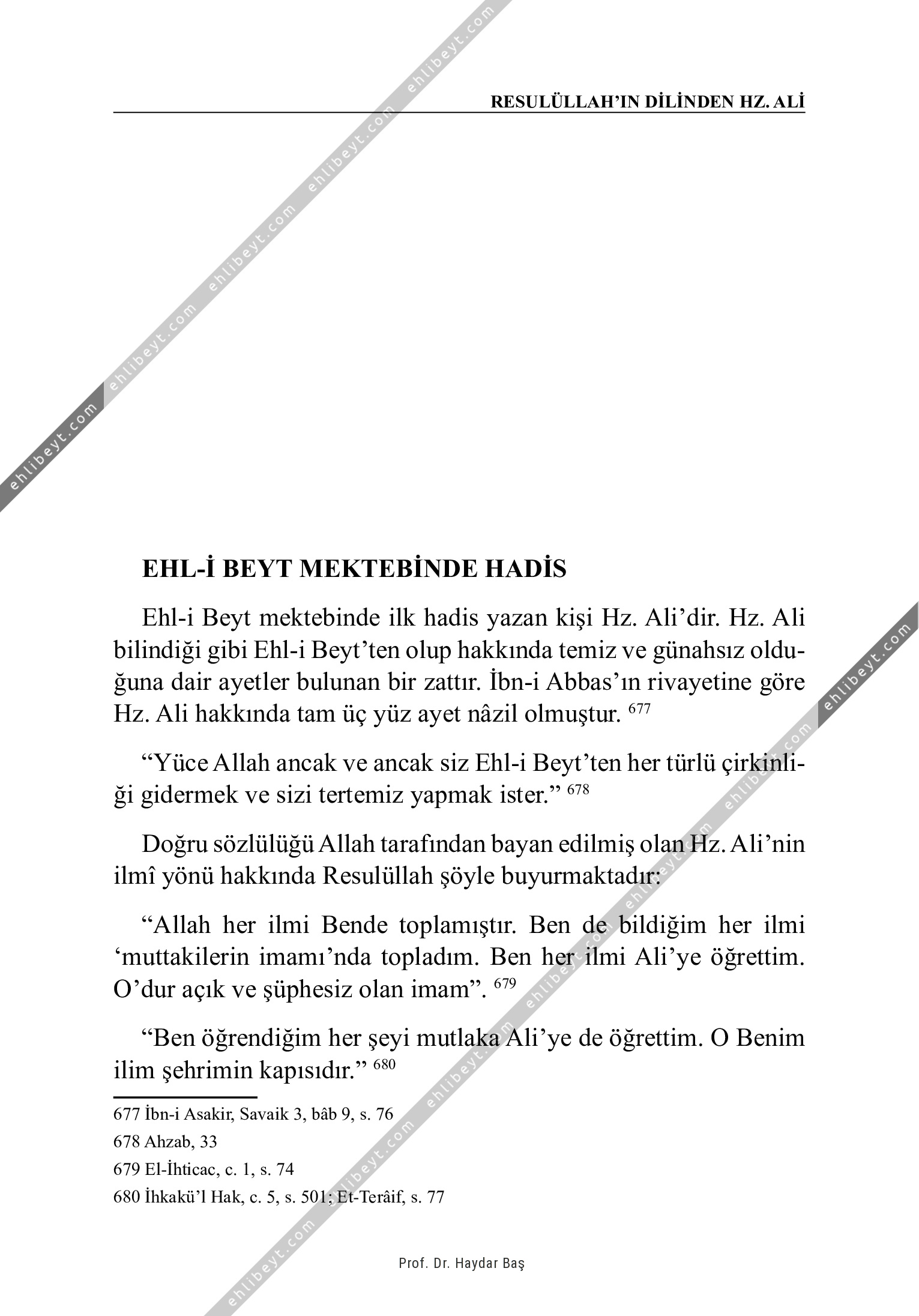Ehl-i Beyt mektebinde ilk hadis yazan kişi Hz. Ali'dir. Hz. Ali bilindiği gibi Ehl-i Beyt'ten olup hakkında temiz ve günahsız olduğuna dair ayetler bulunan bir zattır. İbn-i Abbas'ın rivayetine göre Hz. Ali hakkında tam üç yüz ayet nâzil olmuştur. 677 "Yüce Allah ancak ve ancak siz Ehl-i Beyt'ten her türlü çirkinliği gidermek ve sizi tertemiz yapmak ister." 678 Doğru sözlülüğü Allah tarafından bayan edilmiş olan Hz. Ali'nin ilmî yönü hakkında Resulüllah şöyle buyurmaktadır: "Allah her ilmi Bende toplamıştır. Ben de bildiğim her ilmi `muttakilerin imamı'nda topladım. Ben her ilmi Ali'ye öğrettim. O'dur açık ve şüphesiz olan imam". 679 "Ben öğrendiğim her şeyi mutlaka Ali'ye de öğrettim. O Benim ilim şehrimin kapısıdır." 680 677 İbn-i Asakir, Savaik 3, bâb 9, s. 76 678 Ahzab, 33 679 El-İhticac, c. 1, s. 74 680 İhkakü'l Hak, c. 5, s. 501; Et-Terâif, s. 77
