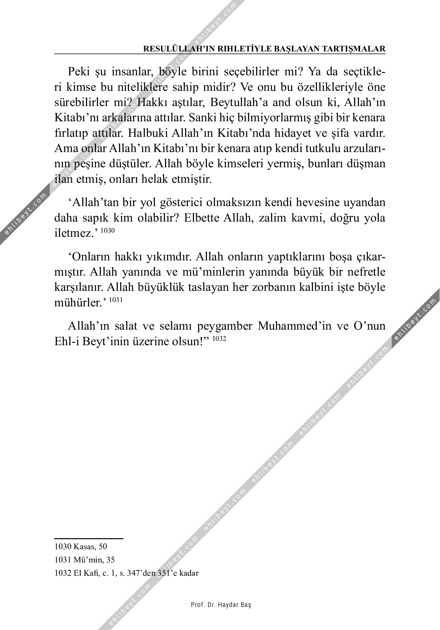 Peki şu insanlar, böyle birini seçebilirler mi? Ya da seçtikleri kimse bu niteliklere sahip midir? Ve onu bu özellikleriyle öne sürebilirler mi? Hakkı aştılar, Beytullah'a and olsun ki, Allah'ın Kitabı'nı arkalarına attılar. Sanki hiç bilmiyorlarmış gibi bir kenara fırlatıp attılar. Halbuki Allah'ın Kitabı'nda hidayet ve şifa vardır. Ama onlar Allah'ın Kitabı'nı bir kenara atıp kendi tutkulu arzularının peşine düştüler. Allah böyle kimseleri yermiş, bunları düşman ilan etmiş, onları helak etmiştir. `Allah'tan bir yol gösterici olmaksızın kendi hevesine uyandan daha sapık kim olabilir? Elbette Allah, zalim kavmi, doğru yola iletmez.' 1030 `Onların hakkı yıkımdır. Allah onların yaptıklarını boşa çıkarmıştır. Allah yanında ve mü'minlerin yanında büyük bir nefretle karşılanır. Allah büyüklük taslayan her zorbanın kalbini işte böyle mühürler.' 1031 Allah'ın salat ve selamı peygamber Muhammed'in ve O'nun Ehl-i Beyt'inin üzerine olsun!" 1032 1030 Kasas, 50 1031 Mü'min, 35 1032 El Kafi, c. 1, s. 347'den 351'e kadar