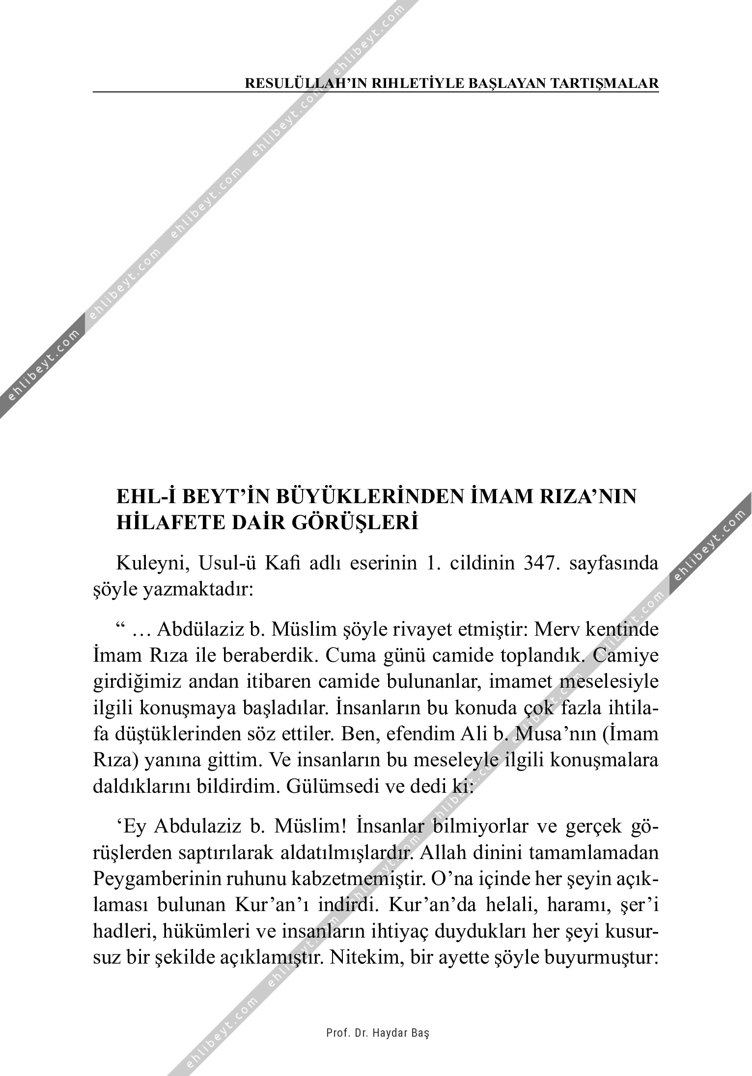 Kuleyni, Usul-ü Kafi adlı eserinin 1. cildinin 347. sayfasında şöyle yazmaktadır: " ... Abdülaziz b. Müslim şöyle rivayet etmiştir: Merv kentinde İmam Rıza ile beraberdik. Cuma günü camide toplandık. Camiye girdiğimiz andan itibaren camide bulunanlar, imamet meselesiyle ilgili konuşmaya başladılar. İnsanların bu konuda çok fazla ihtilafa düştüklerinden söz ettiler. Ben, efendim Ali b. Musa'nın (İmam Rıza) yanına gittim. Ve insanların bu meseleyle ilgili konuşmalara daldıklarını bildirdim. Gülümsedi ve dedi ki: `Ey Abdulaziz b. Müslim! İnsanlar bilmiyorlar ve gerçek görüşlerden saptırılarak aldatılmışlardır. Allah dinini tamamlamadan Peygamberinin ruhunu kabzetmemiştir. O'na içinde her şeyin açıklaması bulunan Kur'an'ı indirdi. Kur'an'da helali, haramı, şer'i hadleri, hükümleri ve insanların ihtiyaç duydukları her şeyi kusursuz bir şekilde açıklamıştır. Nitekim, bir ayette şöyle buyurmuştur:
