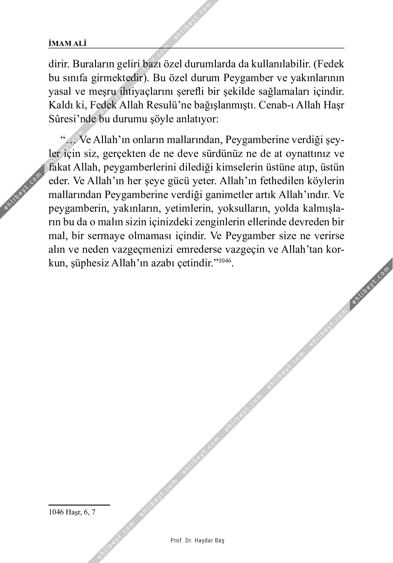 dirir. Buraların geliri bazı özel durumlarda da kullanılabilir. (Fedek bu sınıfa girmektedir). Bu özel durum Peygamber ve yakınlarının yasal ve meşru ihtiyaçlarını şerefli bir şekilde sağlamaları içindir. Kaldı ki, Fedek Allah Resulü'ne bağışlanmıştı. Cenab-ı Allah Haşr Sûresi'nde bu durumu şöyle anlatıyor: "... Ve Allah'ın onların mallarından, Peygamberine verdiği şeyler için siz, gerçekten de ne deve sürdünüz ne de at oynattınız ve fakat Allah, peygamberlerini dilediği kimselerin üstüne atıp, üstün eder. Ve Allah'ın her şeye gücü yeter. Allah'ın fethedilen köylerin mallarından Peygamberine verdiği ganimetler artık Allah'ındır. Ve peygamberin, yakınların, yetimlerin, yoksulların, yolda kalmışların bu da o malın sizin içinizdeki zenginlerin ellerinde devreden bir mal, bir sermaye olmaması içindir. Ve Peygamber size ne verirse alın ve neden vazgeçmenizi emrederse vazgeçin ve Allah'tan korkun, şüphesiz Allah'ın azabı çetindir."1046.