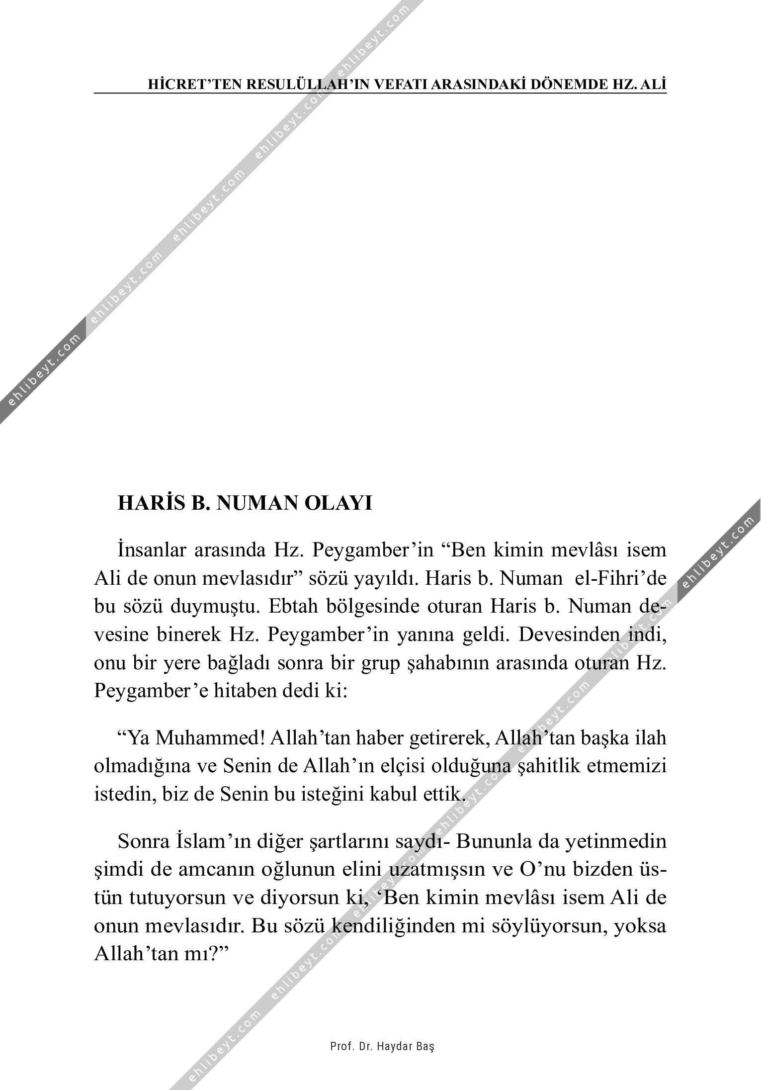 İnsanlar arasında Hz. Peygamber'in "Ben kimin mevlâsı isem Ali de onun mevlasıdır" sözü yayıldı. Haris b. Numan el-Fihri'de bu sözü duymuştu. Ebtah bölgesinde oturan Haris b. Numan devesine binerek Hz. Peygamber'in yanına geldi. Devesinden indi, onu bir yere bağladı sonra bir grup şahabının arasında oturan Hz. Peygamber'e hitaben dedi ki: "Ya Muhammed! Allah'tan haber getirerek, Allah'tan başka ilah olmadığına ve Senin de Allah'ın elçisi olduğuna şahitlik etmemizi istedin, biz de Senin bu isteğini kabul ettik. Sonra İslam'ın diğer şartlarını saydıBununla da yetinmedin şimdi de amcanın oğlunun elini uzatmışsın ve O'nu bizden üstün tutuyorsun ve diyorsun ki, `Ben kimin mevlâsı isem Ali de onun mevlasıdır. Bu sözü kendiliğinden mi söylüyorsun, yoksa Allah'tan mı?"