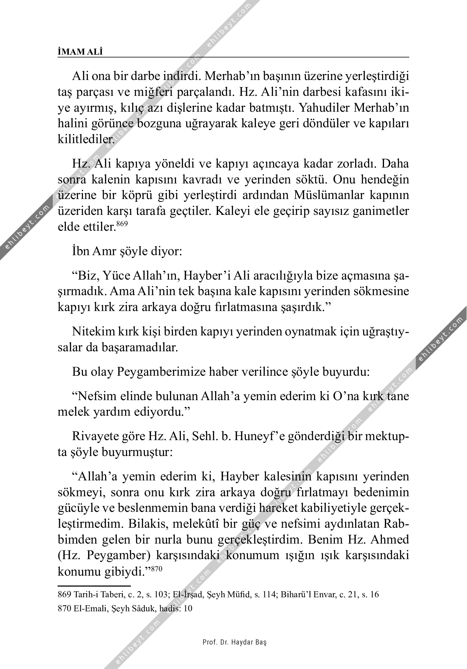 Ali ona bir darbe indirdi. Merhab'ın başının üzerine yerleştirdiği taş parçası ve miğferi parçalandı. Hz. Ali'nin darbesi kafasını ikiye ayırmış, kılıç azı dişlerine kadar batmıştı. Yahudiler Merhab'ın halini görünce bozguna uğrayarak kaleye geri döndüler ve kapıları kilitlediler. Hz. Ali kapıya yöneldi ve kapıyı açıncaya kadar zorladı. Daha sonra kalenin kapısını kavradı ve yerinden söktü. Onu hendeğin üzerine bir köprü gibi yerleştirdi ardından Müslümanlar kapının üzeriden karşı tarafa geçtiler. Kaleyi ele geçirip sayısız ganimetler elde ettiler.869 İbn Amr şöyle diyor: "Biz, Yüce Allah'ın, Hayber'i Ali aracılığıyla bize açmasına şaşırmadık. Ama Ali'nin tek başına kale kapısını yerinden sökmesine kapıyı kırk zira arkaya doğru fırlatmasına şaşırdık." Nitekim kırk kişi birden kapıyı yerinden oynatmak için uğraştıysalar da başaramadılar. Bu olay Peygamberimize haber verilince şöyle buyurdu: "Nefsim elinde bulunan Allah'a yemin ederim ki O'na kırk tane melek yardım ediyordu." Rivayete göre Hz. Ali, Sehl. b. Huneyf'e gönderdiği bir mektupta şöyle buyurmuştur: […]