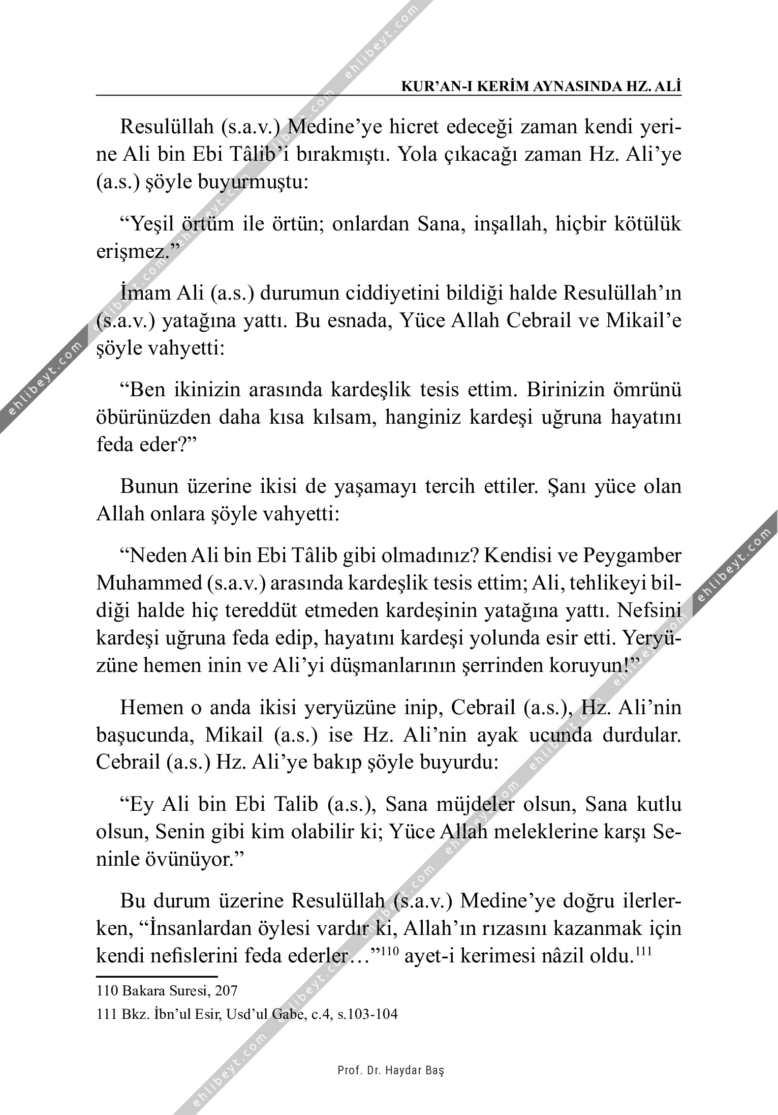Resulüllah (s.a.v.) Medine'ye hicret edeceği zaman kendi yerine Ali bin Ebi Tâlib'i bırakmıştı. Yola çıkacağı zaman Hz. Ali'ye (a.s.) şöyle buyurmuştu: "Yeşil örtüm ile örtün; onlardan Sana, inşallah, hiçbir kötülük erişmez." İmam Ali (a.s.) durumun ciddiyetini bildiği halde Resulüllah'ın (s.a.v.) yatağına yattı. Bu esnada, Yüce Allah Cebrail ve Mikail'e şöyle vahyetti: "Ben ikinizin arasında kardeşlik tesis ettim. Birinizin ömrünü öbürünüzden daha kısa kılsam, hanginiz kardeşi uğruna hayatını feda eder?" Bunun üzerine ikisi de yaşamayı tercih ettiler. Şanı yüce olan Allah onlara şöyle vahyetti: "Neden Ali bin Ebi Tâlib gibi olmadınız? Kendisi ve Peygamber Muhammed (s.a.v.) arasında kardeşlik tesis ettim; Ali, tehlikeyi bildiği halde hiç tereddüt etmeden kardeşinin yatağına yattı. Nefsini kardeşi uğruna feda edip, hayatını kardeşi yolunda esir etti. Yeryüzüne hemen inin ve Ali'yi düşmanlarının şerrinden koruyun!" Hemen o anda ikisi yeryüzüne inip, Cebrail (a.s.), Hz. Ali'nin başucunda, Mikail (a.s.) ise Hz. Ali'nin ayak ucunda durdular. Cebrail […]