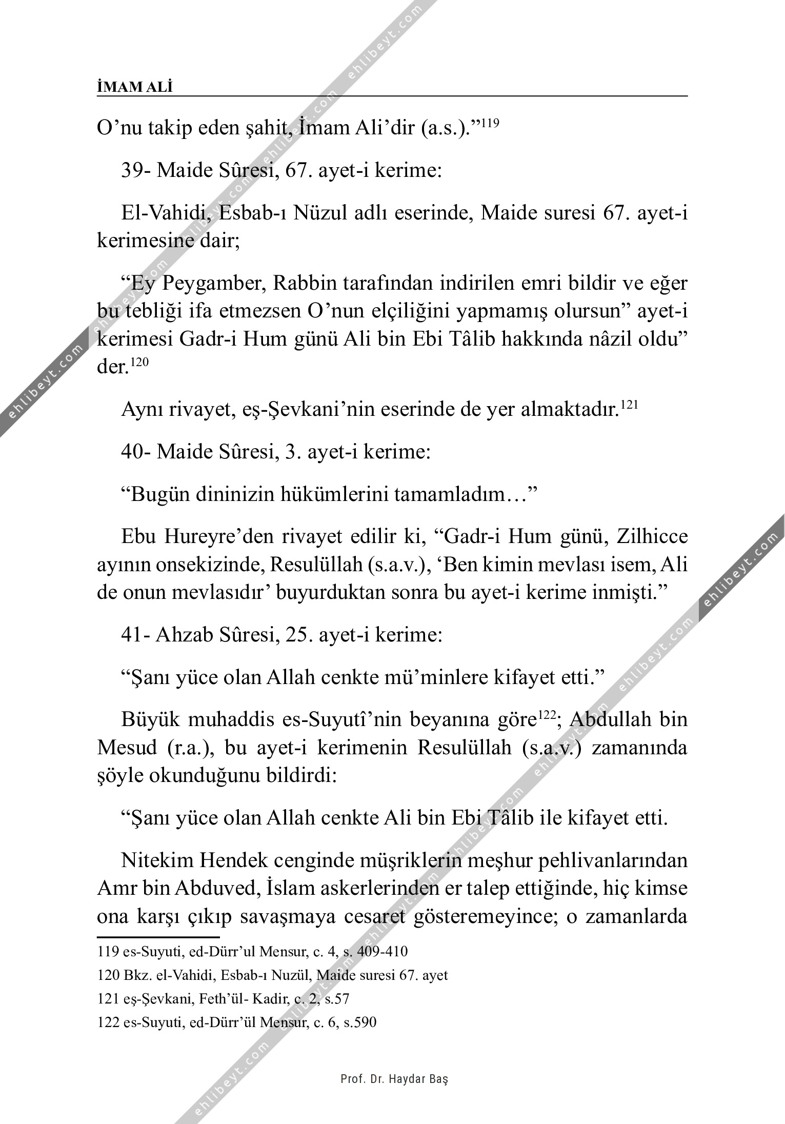O'nu takip eden şahit, İmam Ali'dir (a.s.)."119 39- Maide Sûresi, 67. ayet-i kerime: El-Vahidi, Esbab-ı Nüzul adlı eserinde, Maide suresi 67. ayet-i kerimesine dair; "Ey Peygamber, Rabbin tarafından indirilen emri bildir ve eğer bu tebliği ifa etmezsen O'nun elçiliğini yapmamış olursun" ayet-i kerimesi Gadr-i Hum günü Ali bin Ebi Tâlib hakkında nâzil oldu" der.120 Aynı rivayet, eş-Şevkani'nin eserinde de yer almaktadır.121 40- Maide Sûresi, 3. ayet-i kerime: "Bugün dininizin hükümlerini tamamladım..." Ebu Hureyre'den rivayet edilir ki, "Gadr-i Hum günü, Zilhicce ayının onsekizinde, Resulüllah (s.a.v.), `Ben kimin mevlası isem, Ali de onun mevlasıdır' buyurduktan sonra bu ayet-i kerime inmişti." 41- Ahzab Sûresi, 25. ayet-i kerime: "Şanı yüce olan Allah cenkte mü'minlere kifayet etti." Büyük muhaddis es-Suyutî'nin beyanına göre122; Abdullah bin Mesud (r.a.), bu ayet-i kerimenin Resulüllah (s.a.v.) zamanında şöyle okunduğunu bildirdi: "Şanı yüce olan Allah cenkte Ali bin Ebi Tâlib ile kifayet etti. Nitekim Hendek cenginde müşriklerin meşhur pehlivanlarından Amr bin […]