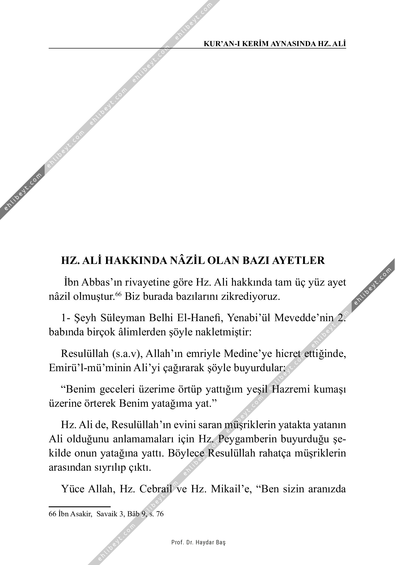 İbn Abbas'ın rivayetine göre Hz. Ali hakkında tam üç yüz ayet nâzil olmuştur.66 Biz burada bazılarını zikrediyoruz. 1- Şeyh Süleyman Belhi El-Hanefi, Yenabi'ül Mevedde'nin 2. babında birçok âlimlerden şöyle nakletmiştir: Resulüllah (s.a.v), Allah'ın emriyle Medine'ye hicret ettiğinde, Emirü'l-mü'minin Ali'yi çağırarak şöyle buyurdular: "Benim geceleri üzerime örtüp yattığım yeşil Hazremi kumaşı üzerine örterek Benim yatağıma yat." Hz. Ali de, Resulüllah'ın evini saran müşriklerin yatakta yatanın Ali olduğunu anlamamaları için Hz. Peygamberin buyurduğu şekilde onun yatağına yattı. Böylece Resulüllah rahatça müşriklerin arasından sıyrılıp çıktı. Yüce Allah, Hz. Cebrail ve Hz. Mikail'e, "Ben sizin aranızda 66 İbn Asakir, Savaik 3, Bâb 9, s. 76