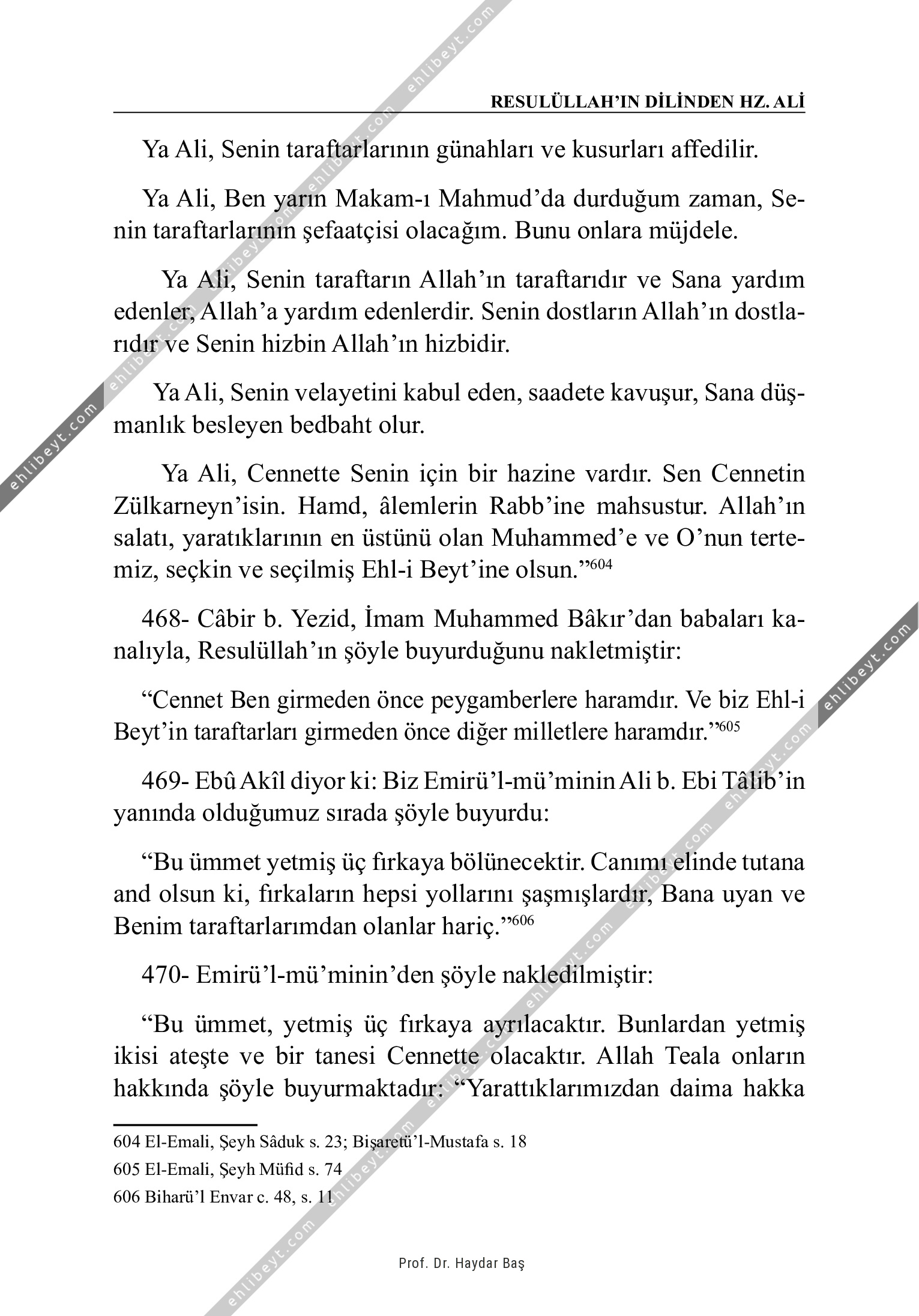 Ya Ali, Senin taraftarlarının günahları ve kusurları affedilir. Ya Ali, Ben yarın Makam-ı Mahmud'da durduğum zaman, Senin taraftarlarının şefaatçisi olacağım. Bunu onlara müjdele. Ya Ali, Senin taraftarın Allah'ın taraftarıdır ve Sana yardım edenler, Allah'a yardım edenlerdir. Senin dostların Allah'ın dostlarıdır ve Senin hizbin Allah'ın hizbidir. Ya Ali, Senin velayetini kabul eden, saadete kavuşur, Sana düşmanlık besleyen bedbaht olur. Ya Ali, Cennette Senin için bir hazine vardır. Sen Cennetin Zülkarneyn'isin. Hamd, âlemlerin Rabb'ine mahsustur. Allah'ın salatı, yaratıklarının en üstünü olan Muhammed'e ve O'nun tertemiz, seçkin ve seçilmiş Ehl-i Beyt'ine olsun."604 468- Câbir b. Yezid, İmam Muhammed Bâkır'dan babaları kanalıyla, Resulüllah'ın şöyle buyurduğunu nakletmiştir: "Cennet Ben girmeden önce peygamberlere haramdır. Ve biz Ehl-i Beyt'in taraftarları girmeden önce diğer milletlere haramdır."605 469- Ebû Akîl diyor ki: Biz Emirü'l-mü'minin Ali b. Ebi Tâlib'in yanında olduğumuz sırada şöyle buyurdu: "Bu ümmet yetmiş üç fırkaya bölünecektir. Canımı elinde tutana and olsun […]