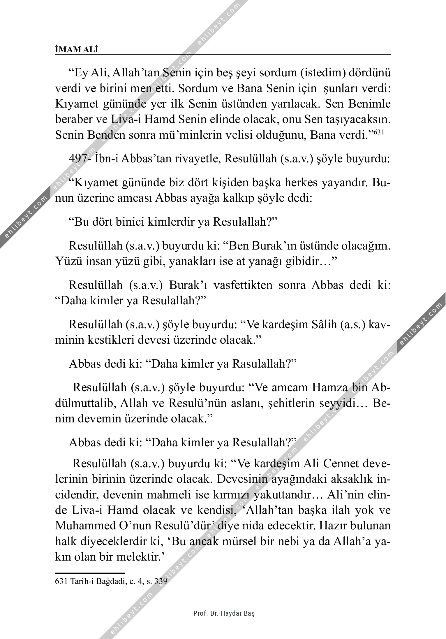 "Ey Ali, Allah'tan Senin için beş şeyi sordum (istedim) dördünü verdi ve birini men etti. Sordum ve Bana Senin için şunları verdi: Kıyamet gününde yer ilk Senin üstünden yarılacak. Sen Benimle beraber ve Liva-i Hamd Senin elinde olacak, onu Sen taşıyacaksın. Senin Benden sonra mü'minlerin velisi olduğunu, Bana verdi."631 497- İbn-i Abbas'tan rivayetle, Resulüllah (s.a.v.) şöyle buyurdu: "Kıyamet gününde biz dört kişiden başka herkes yayandır. Bunun üzerine amcası Abbas ayağa kalkıp şöyle dedi: "Bu dört binici kimlerdir ya Resulallah?" Resulüllah (s.a.v.) buyurdu ki: "Ben Burak'ın üstünde olacağım. Yüzü insan yüzü gibi, yanakları ise at yanağı gibidir..." Resulüllah (s.a.v.) Burak'ı vasfettikten sonra Abbas dedi ki: "Daha kimler ya Resulallah?" Resulüllah (s.a.v.) şöyle buyurdu: "Ve kardeşim Sâlih (a.s.) kavminin kestikleri devesi üzerinde olacak." Abbas dedi ki: "Daha kimler ya Rasulallah?" Resulüllah (s.a.v.) şöyle buyurdu: "Ve amcam Hamza bin Abdülmuttalib, Allah ve Resulü'nün aslanı, şehitlerin seyyidi... Benim devemin üzerinde […]