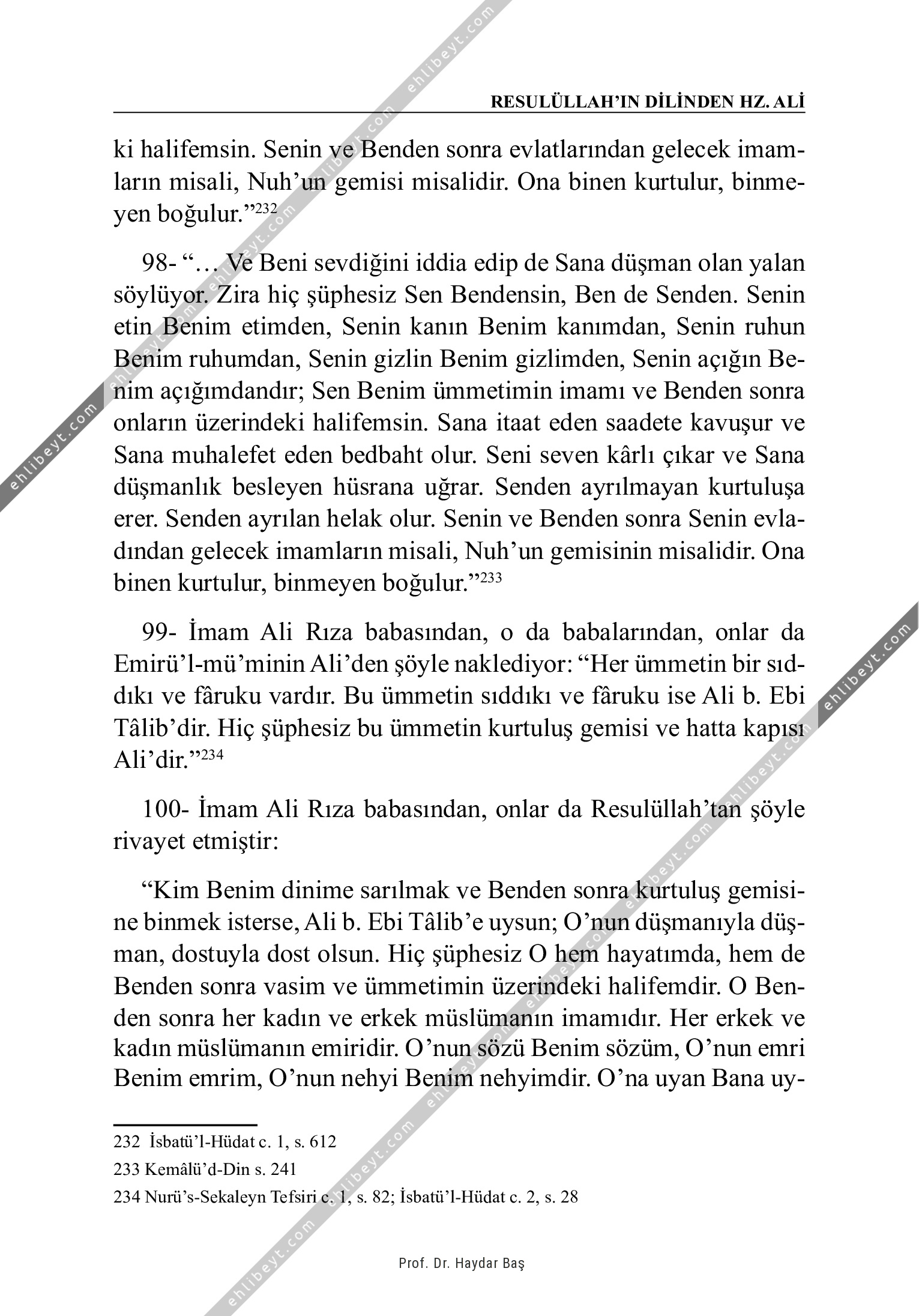 ki halifemsin. Senin ve Benden sonra evlatlarından gelecek imamların misali, Nuh'un gemisi misalidir. Ona binen kurtulur, binmeyen boğulur."232 98- "... Ve Beni sevdiğini iddia edip de Sana düşman olan yalan söylüyor. Zira hiç şüphesiz Sen Bendensin, Ben de Senden. Senin etin Benim etimden, Senin kanın Benim kanımdan, Senin ruhun Benim ruhumdan, Senin gizlin Benim gizlimden, Senin açığın Benim açığımdandır; Sen Benim ümmetimin imamı ve Benden sonra onların üzerindeki halifemsin. Sana itaat eden saadete kavuşur ve Sana muhalefet eden bedbaht olur. Seni seven kârlı çıkar ve Sana düşmanlık besleyen hüsrana uğrar. Senden ayrılmayan kurtuluşa erer. Senden ayrılan helak olur. Senin ve Benden sonra Senin evladından gelecek imamların misali, Nuh'un gemisinin misalidir. Ona binen kurtulur, binmeyen boğulur."233 99- İmam Ali Rıza babasından, o da babalarından, onlar da Emirü'l-mü'minin Ali'den şöyle naklediyor: "Her ümmetin bir sıddıkı ve fâruku vardır. Bu ümmetin sıddıkı ve fâruku ise Ali b. Ebi […]