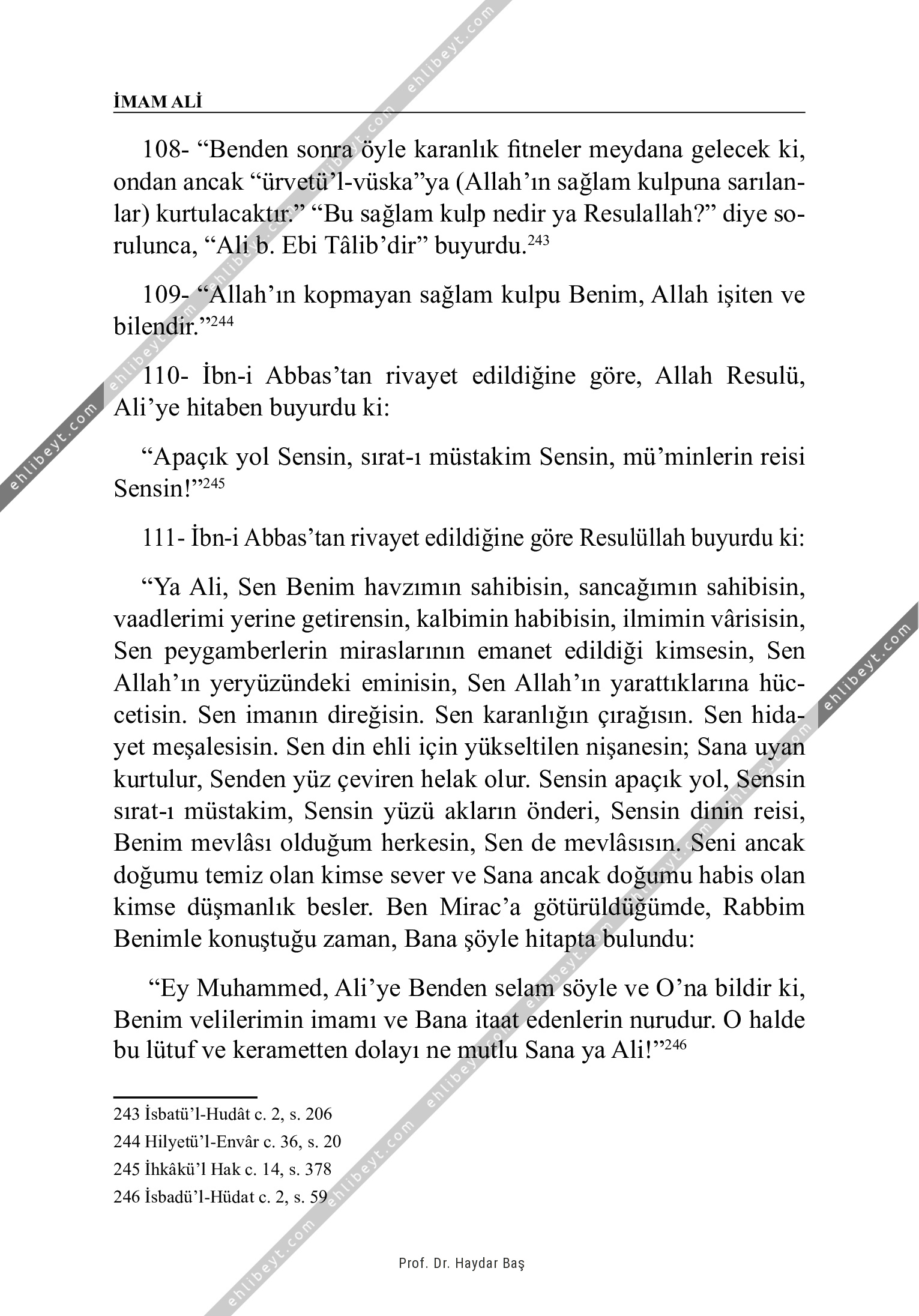 108- "Benden sonra öyle karanlık fitneler meydana gelecek ki, ondan ancak "ürvetü'l-vüska"ya (Allah'ın sağlam kulpuna sarılanlar) kurtulacaktır." "Bu sağlam kulp nedir ya Resulallah?" diye sorulunca, "Ali b. Ebi Tâlib'dir" buyurdu.243 109- "Allah'ın kopmayan sağlam kulpu Benim, Allah işiten ve bilendir."244 110- İbn-i Abbas'tan rivayet edildiğine göre, Allah Resulü, Ali'ye hitaben buyurdu ki: "Apaçık yol Sensin, sırat-ı müstakim Sensin, mü'minlerin reisi Sensin!"245 111- İbn-i Abbas'tan rivayet edildiğine göre Resulüllah buyurdu ki: "Ya Ali, Sen Benim havzımın sahibisin, sancağımın sahibisin, vaadlerimi yerine getirensin, kalbimin habibisin, ilmimin vârisisin, Sen peygamberlerin miraslarının emanet edildiği kimsesin, Sen Allah'ın yeryüzündeki eminisin, Sen Allah'ın yarattıklarına hüccetisin. Sen imanın direğisin. Sen karanlığın çırağısın. Sen hidayet meşalesisin. Sen din ehli için yükseltilen nişanesin; Sana uyan kurtulur, Senden yüz çeviren helak olur. Sensin apaçık yol, Sensin sırat-ı müstakim, Sensin yüzü akların önderi, Sensin dinin reisi, Benim mevlâsı olduğum herkesin, Sen de mevlâsısın. Seni ancak doğumu temiz […]
