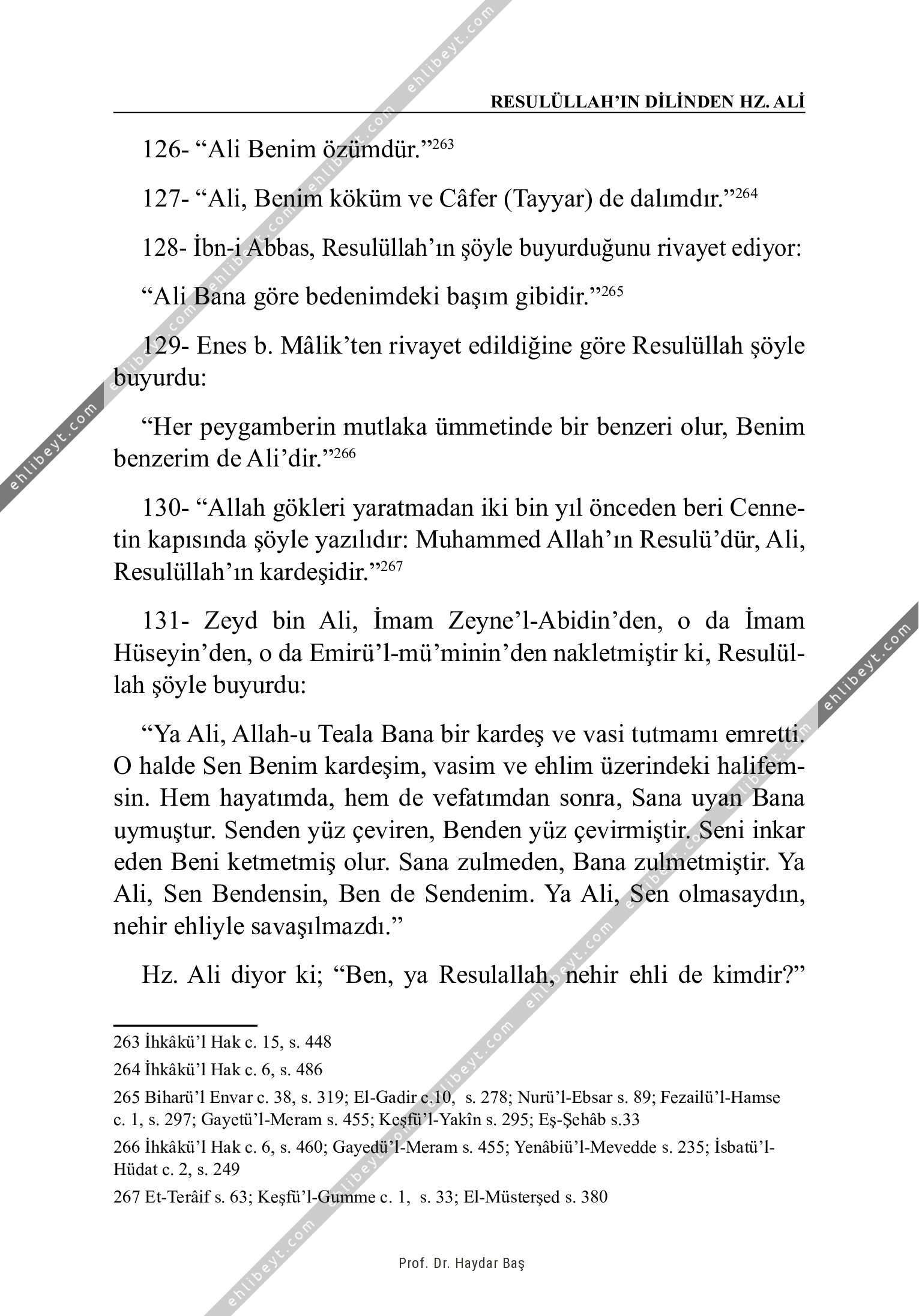 126- "Ali Benim özümdür."263 127- "Ali, Benim köküm ve Câfer (Tayyar) de dalımdır."264 128- İbn-i Abbas, Resulüllah'ın şöyle buyurduğunu rivayet ediyor: "Ali Bana göre bedenimdeki başım gibidir."265 129- Enes b. Mâlik'ten rivayet edildiğine göre Resulüllah şöyle buyurdu: "Her peygamberin mutlaka ümmetinde bir benzeri olur, Benim benzerim de Ali'dir."266 130- "Allah gökleri yaratmadan iki bin yıl önceden beri Cennetin kapısında şöyle yazılıdır: Muhammed Allah'ın Resulü'dür, Ali, Resulüllah'ın kardeşidir."267 131- Zeyd bin Ali, İmam Zeyne'l-Abidin'den, o da İmam Hüseyin'den, o da Emirü'l-mü'minin'den nakletmiştir ki, Resulüllah şöyle buyurdu: "Ya Ali, Allah-u Teala Bana bir kardeş ve vasi tutmamı emretti. O halde Sen Benim kardeşim, vasim ve ehlim üzerindeki halifemsin. Hem hayatımda, hem de vefatımdan sonra, Sana uyan Bana uymuştur. Senden yüz çeviren, Benden yüz çevirmiştir. Seni inkar eden Beni ketmetmiş olur. Sana zulmeden, Bana zulmetmiştir. Ya Ali, Sen Bendensin, Ben de Sendenim. Ya Ali, Sen olmasaydın, nehir ehliyle savaşılmazdı." Hz. […]
