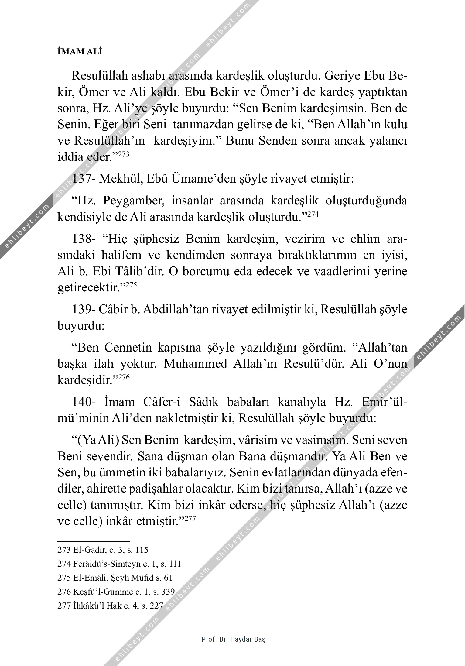 Resulüllah ashabı arasında kardeşlik oluşturdu. Geriye Ebu Bekir, Ömer ve Ali kaldı. Ebu Bekir ve Ömer'i de kardeş yaptıktan sonra, Hz. Ali'ye şöyle buyurdu: "Sen Benim kardeşimsin. Ben de Senin. Eğer biri Seni tanımazdan gelirse de ki, "Ben Allah'ın kulu ve Resulüllah'ın kardeşiyim." Bunu Senden sonra ancak yalancı iddia eder."273 137- Mekhül, Ebû Ümame'den şöyle rivayet etmiştir: "Hz. Peygamber, insanlar arasında kardeşlik oluşturduğunda kendisiyle de Ali arasında kardeşlik oluşturdu."274 138- "Hiç şüphesiz Benim kardeşim, vezirim ve ehlim arasındaki halifem ve kendimden sonraya bıraktıklarımın en iyisi, Ali b. Ebi Tâlib'dir. O borcumu eda edecek ve vaadlerimi yerine getirecektir."275 139- Câbir b. Abdillah'tan rivayet edilmiştir ki, Resulüllah şöyle buyurdu: "Ben Cennetin kapısına şöyle yazıldığını gördüm. "Allah'tan başka ilah yoktur. Muhammed Allah'ın Resulü'dür. Ali O'nun kardeşidir."276 140- İmam Câfer-i Sâdık babaları kanalıyla Hz. Emir'ülmü'minin Ali'den nakletmiştir ki, Resulüllah şöyle buyurdu: "(Ya Ali) Sen Benim kardeşim, vârisim ve vasimsim. Seni seven […]