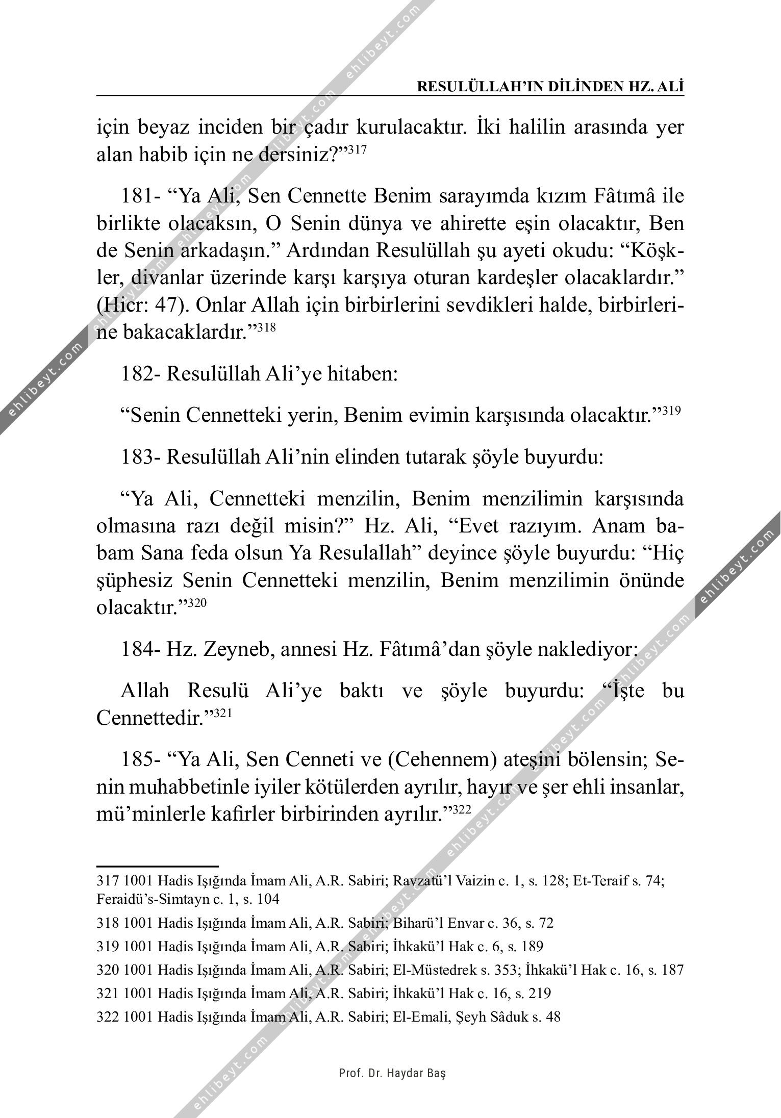 için beyaz inciden bir çadır kurulacaktır. İki halilin arasında yer alan habib için ne dersiniz?"317 181- "Ya Ali, Sen Cennette Benim sarayımda kızım Fâtımâ ile birlikte olacaksın, O Senin dünya ve ahirette eşin olacaktır, Ben de Senin arkadaşın." Ardından Resulüllah şu ayeti okudu: "Köşkler, divanlar üzerinde karşı karşıya oturan kardeşler olacaklardır." (Hicr: 47). Onlar Allah için birbirlerini sevdikleri halde, birbirlerine bakacaklardır."318 182- Resulüllah Ali'ye hitaben: "Senin Cennetteki yerin, Benim evimin karşısında olacaktır."319 183- Resulüllah Ali'nin elinden tutarak şöyle buyurdu: "Ya Ali, Cennetteki menzilin, Benim menzilimin karşısında olmasına razı değil misin?" Hz. Ali, "Evet razıyım. Anam babam Sana feda olsun Ya Resulallah" deyince şöyle buyurdu: "Hiç şüphesiz Senin Cennetteki menzilin, Benim menzilimin önünde olacaktır."320 184- Hz. Zeyneb, annesi Hz. Fâtımâ'dan şöyle naklediyor: Allah Resulü Ali'ye baktı ve şöyle buyurdu: "İşte bu Cennettedir."321 185- "Ya Ali, Sen Cenneti ve (Cehennem) ateşini bölensin; Senin muhabbetinle iyiler kötülerden ayrılır, hayır […]