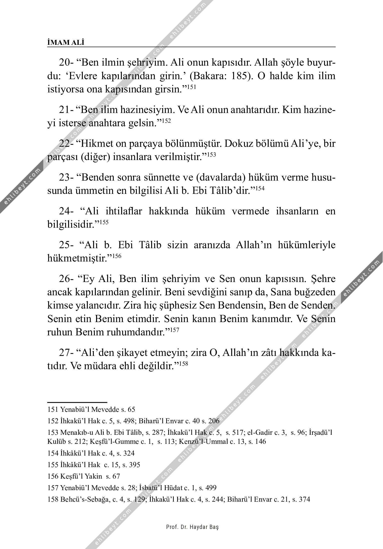 20- "Ben ilmin şehriyim. Ali onun kapısıdır. Allah şöyle buyurdu: `Evlere kapılarından girin.' (Bakara: 185). O halde kim ilim istiyorsa ona kapısından girsin."151 21- "Ben ilim hazinesiyim. Ve Ali onun anahtarıdır. Kim hazineyi isterse anahtara gelsin."152 22- "Hikmet on parçaya bölünmüştür. Dokuz bölümü Ali'ye, bir parçası (diğer) insanlara verilmiştir."153 23- "Benden sonra sünnette ve (davalarda) hüküm verme hususunda ümmetin en bilgilisi Ali b. Ebi Tâlib'dir."154 24- "Ali ihtilaflar hakkında hüküm vermede ihsanların en bilgilisidir."155 25- "Ali b. Ebi Tâlib sizin aranızda Allah'ın hükümleriyle hükmetmiştir."156 26- "Ey Ali, Ben ilim şehriyim ve Sen onun kapısısın. Şehre ancak kapılarından gelinir. Beni sevdiğini sanıp da, Sana buğzeden kimse yalancıdır. Zira hiç şüphesiz Sen Bendensin, Ben de Senden. Senin etin Benim etimdir. Senin kanın Benim kanımdır. Ve Senin ruhun Benim ruhumdandır."157 27- "Ali'den şikayet etmeyin; zira O, Allah'ın zâtı hakkında katıdır. Ve müdara ehli değildir."158 151 Yenabiü'l Mevedde s. 65 […]