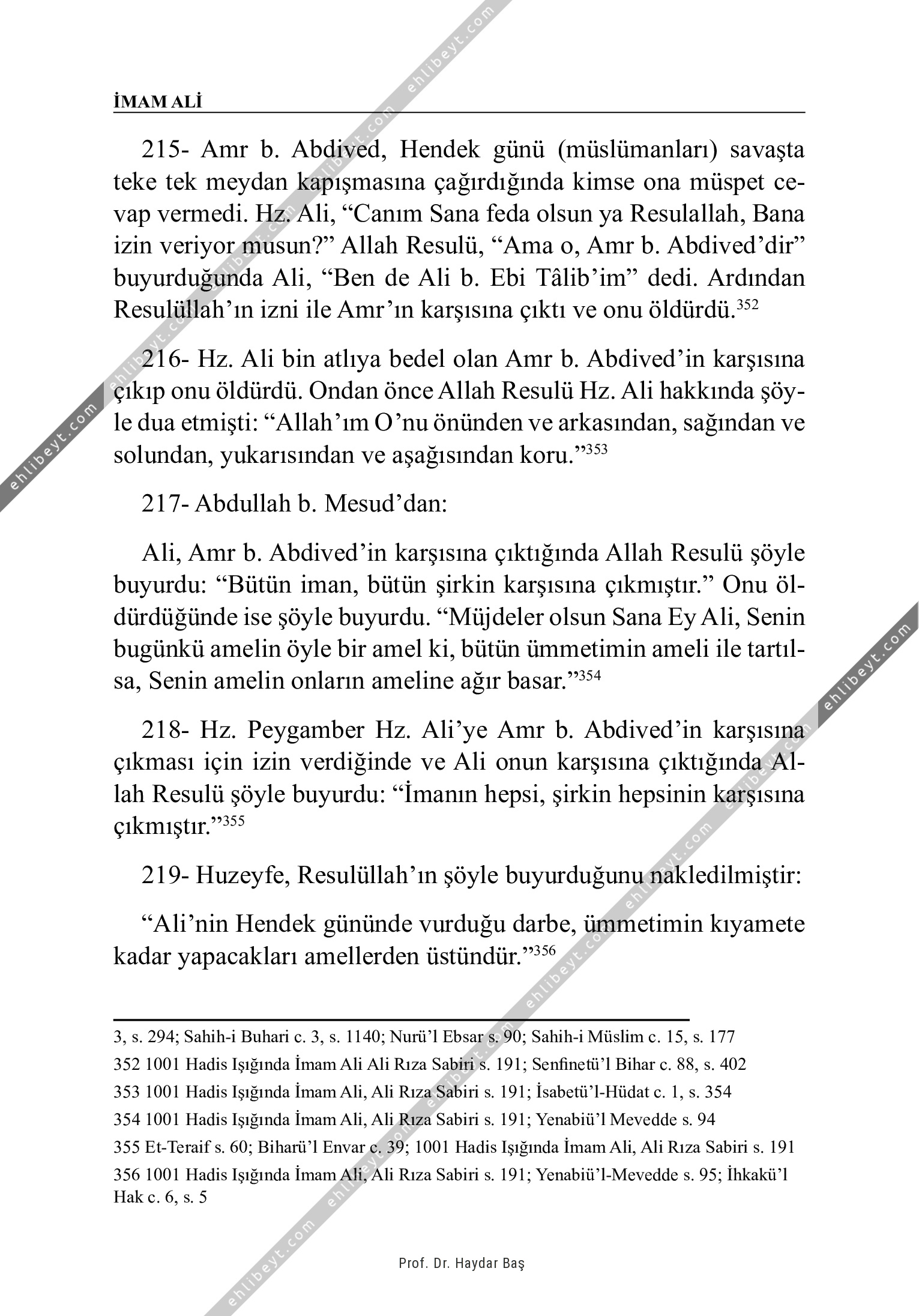 215- Amr b. Abdived, Hendek günü (müslümanları) savaşta teke tek meydan kapışmasına çağırdığında kimse ona müspet cevap vermedi. Hz. Ali, "Canım Sana feda olsun ya Resulallah, Bana izin veriyor musun?" Allah Resulü, "Ama o, Amr b. Abdived'dir" buyurduğunda Ali, "Ben de Ali b. Ebi Tâlib'im" dedi. Ardından Resulüllah'ın izni ile Amr'ın karşısına çıktı ve onu öldürdü.352 216- Hz. Ali bin atlıya bedel olan Amr b. Abdived'in karşısına çıkıp onu öldürdü. Ondan önce Allah Resulü Hz. Ali hakkında şöyle dua etmişti: "Allah'ım O'nu önünden ve arkasından, sağından ve solundan, yukarısından ve aşağısından koru."353 217- Abdullah b. Mesud'dan: Ali, Amr b. Abdived'in karşısına çıktığında Allah Resulü şöyle buyurdu: "Bütün iman, bütün şirkin karşısına çıkmıştır." Onu öldürdüğünde ise şöyle buyurdu. "Müjdeler olsun Sana Ey Ali, Senin bugünkü amelin öyle bir amel ki, bütün ümmetimin ameli ile tartılsa, Senin amelin onların ameline ağır basar."354 218- Hz. Peygamber Hz. Ali'ye Amr […]