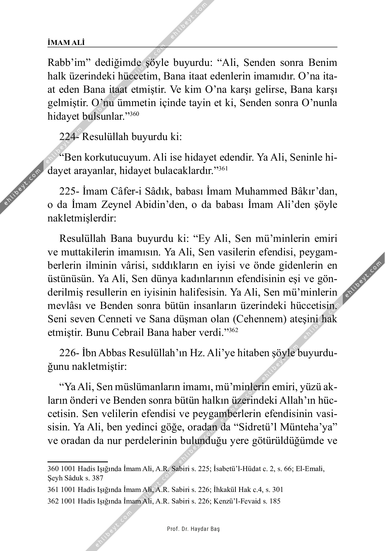 Rabb'im" dediğimde şöyle buyurdu: "Ali, Senden sonra Benim halk üzerindeki hüccetim, Bana itaat edenlerin imamıdır. O'na itaat eden Bana itaat etmiştir. Ve kim O'na karşı gelirse, Bana karşı gelmiştir. O'nu ümmetin içinde tayin et ki, Senden sonra O'nunla hidayet bulsunlar."360 224- Resulüllah buyurdu ki: "Ben korkutucuyum. Ali ise hidayet edendir. Ya Ali, Seninle hidayet arayanlar, hidayet bulacaklardır."361 225- İmam Câfer-i Sâdık, babası İmam Muhammed Bâkır'dan, o da İmam Zeynel Abidin'den, o da babası İmam Ali'den şöyle nakletmişlerdir: Resulüllah Bana buyurdu ki: "Ey Ali, Sen mü'minlerin emiri ve muttakilerin imamısın. Ya Ali, Sen vasilerin efendisi, peygamberlerin ilminin vârisi, sıddıkların en iyisi ve önde gidenlerin en üstünüsün. Ya Ali, Sen dünya kadınlarının efendisinin eşi ve gönderilmiş resullerin en iyisinin halifesisin. Ya Ali, Sen mü'minlerin mevlâsı ve Benden sonra bütün insanların üzerindeki hüccetisin. Seni seven Cenneti ve Sana düşman olan (Cehennem) ateşini hak etmiştir. Bunu Cebrail Bana haber verdi."362 […]