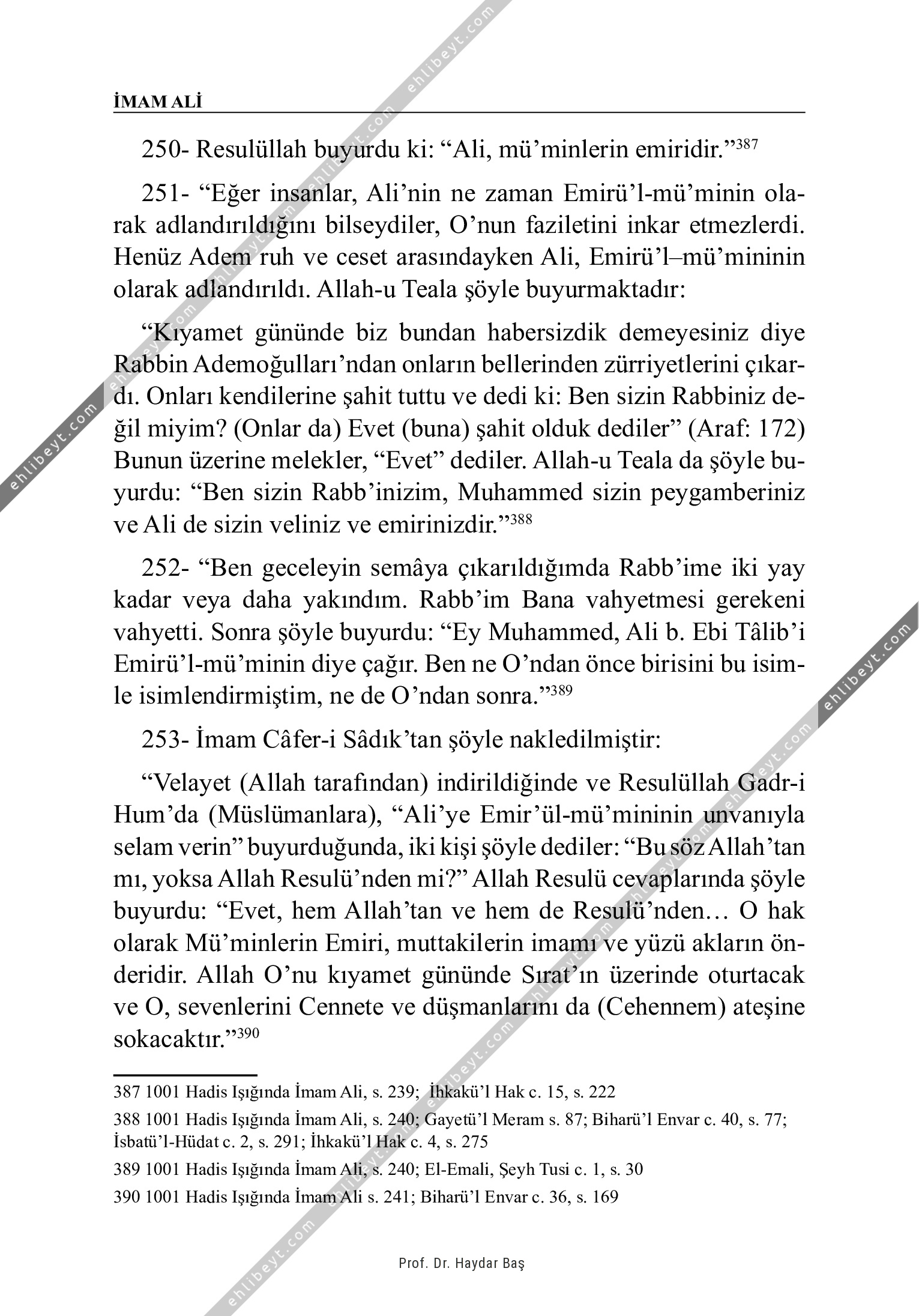 250- Resulüllah buyurdu ki: "Ali, mü'minlerin emiridir."387 251- "Eğer insanlar, Ali'nin ne zaman Emirü'l-mü'minin olarak adlandırıldığını bilseydiler, O'nun faziletini inkar etmezlerdi. Henüz Adem ruh ve ceset arasındayken Ali, Emirü'lmü'mininin olarak adlandırıldı. Allah-u Teala şöyle buyurmaktadır: "Kıyamet gününde biz bundan habersizdik demeyesiniz diye Rabbin Ademoğulları'ndan onların bellerinden zürriyetlerini çıkardı. Onları kendilerine şahit tuttu ve dedi ki: Ben sizin Rabbiniz değil miyim? (Onlar da) Evet (buna) şahit olduk dediler" (Araf: 172) Bunun üzerine melekler, "Evet" dediler. Allah-u Teala da şöyle buyurdu: "Ben sizin Rabb'inizim, Muhammed sizin peygamberiniz ve Ali de sizin veliniz ve emirinizdir."388 252- "Ben geceleyin semâya çıkarıldığımda Rabb'ime iki yay kadar veya daha yakındım. Rabb'im Bana vahyetmesi gerekeni vahyetti. Sonra şöyle buyurdu: "Ey Muhammed, Ali b. Ebi Tâlib'i Emirü'l-mü'minin diye çağır. Ben ne O'ndan önce birisini bu isimle isimlendirmiştim, ne de O'ndan sonra."389 253- İmam Câfer-i Sâdık'tan şöyle nakledilmiştir: "Velayet (Allah tarafından) indirildiğinde ve Resulüllah […]