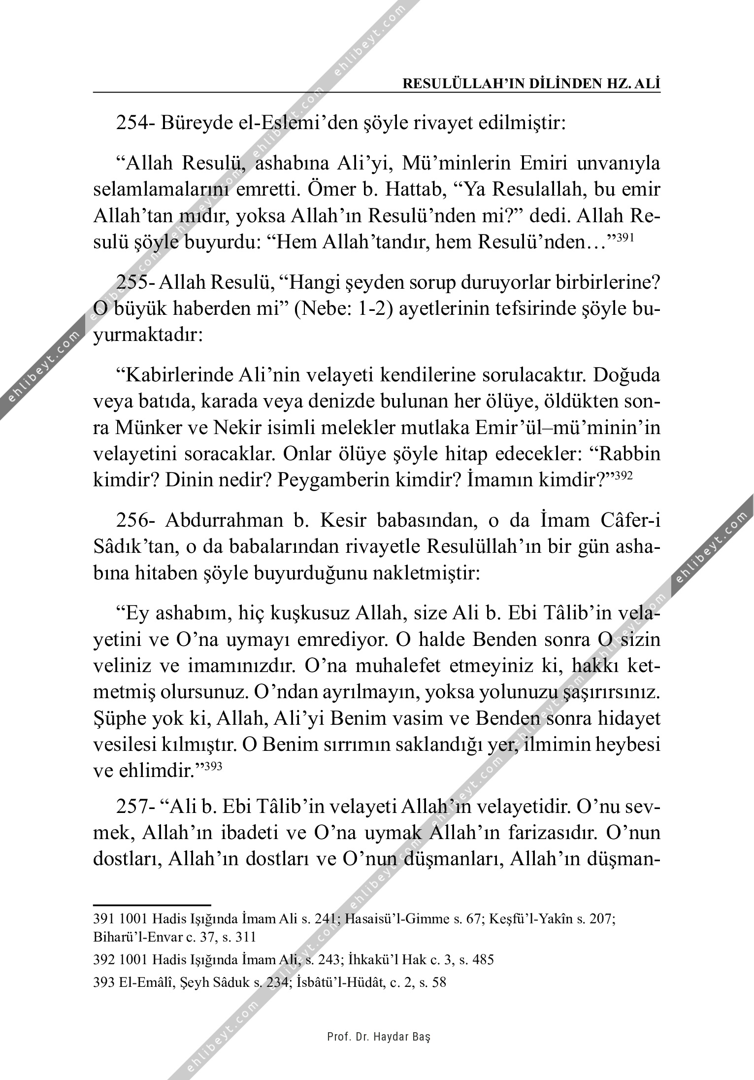 254- Büreyde el-Eslemi'den şöyle rivayet edilmiştir: "Allah Resulü, ashabına Ali'yi, Mü'minlerin Emiri unvanıyla selamlamalarını emretti. Ömer b. Hattab, "Ya Resulallah, bu emir Allah'tan mıdır, yoksa Allah'ın Resulü'nden mi?" dedi. Allah Resulü şöyle buyurdu: "Hem Allah'tandır, hem Resulü'nden..."391 255- Allah Resulü, "Hangi şeyden sorup duruyorlar birbirlerine? O büyük haberden mi" (Nebe: 1-2) ayetlerinin tefsirinde şöyle buyurmaktadır: "Kabirlerinde Ali'nin velayeti kendilerine sorulacaktır. Doğuda veya batıda, karada veya denizde bulunan her ölüye, öldükten sonra Münker ve Nekir isimli melekler mutlaka Emir'ülmü'minin'in velayetini soracaklar. Onlar ölüye şöyle hitap edecekler: "Rabbin kimdir? Dinin nedir? Peygamberin kimdir? İmamın kimdir?"392 256- Abdurrahman b. Kesir babasından, o da İmam Câfer-i Sâdık'tan, o da babalarından rivayetle Resulüllah'ın bir gün ashabına hitaben şöyle buyurduğunu nakletmiştir: "Ey ashabım, hiç kuşkusuz Allah, size Ali b. Ebi Tâlib'in velayetini ve O'na uymayı emrediyor. O halde Benden sonra O sizin veliniz ve imamınızdır. O'na muhalefet etmeyiniz ki, hakkı ket[…]