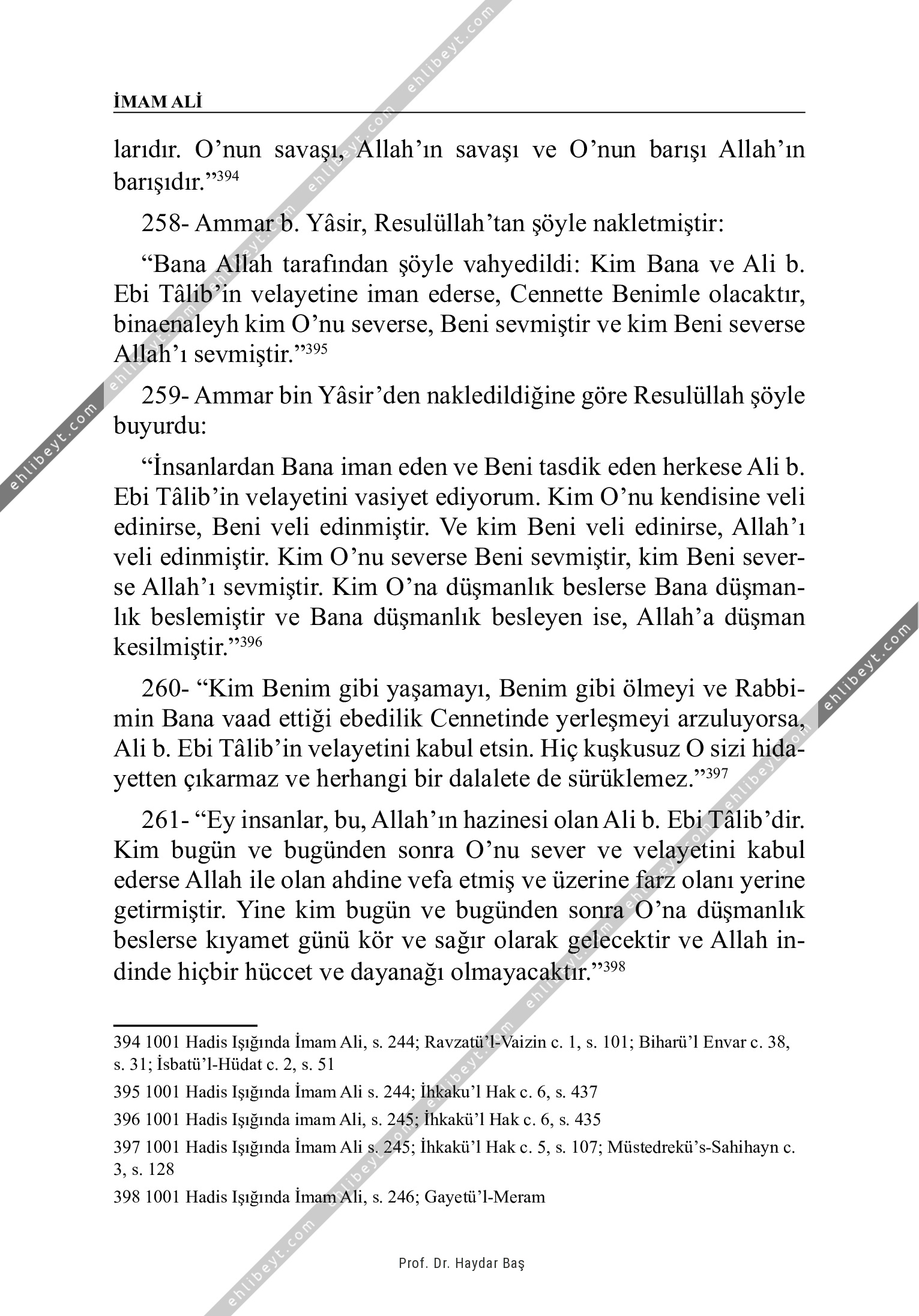 larıdır. O'nun savaşı, Allah'ın savaşı ve O'nun barışı Allah'ın barışıdır."394 258- Ammar b. Yâsir, Resulüllah'tan şöyle nakletmiştir: "Bana Allah tarafından şöyle vahyedildi: Kim Bana ve Ali b. Ebi Tâlib'in velayetine iman ederse, Cennette Benimle olacaktır, binaenaleyh kim O'nu severse, Beni sevmiştir ve kim Beni severse Allah'ı sevmiştir."395 259- Ammar bin Yâsir'den nakledildiğine göre Resulüllah şöyle buyurdu: "İnsanlardan Bana iman eden ve Beni tasdik eden herkese Ali b. Ebi Tâlib'in velayetini vasiyet ediyorum. Kim O'nu kendisine veli edinirse, Beni veli edinmiştir. Ve kim Beni veli edinirse, Allah'ı veli edinmiştir. Kim O'nu severse Beni sevmiştir, kim Beni severse Allah'ı sevmiştir. Kim O'na düşmanlık beslerse Bana düşmanlık beslemiştir ve Bana düşmanlık besleyen ise, Allah'a düşman kesilmiştir."396 260- "Kim Benim gibi yaşamayı, Benim gibi ölmeyi ve Rabbimin Bana vaad ettiği ebedilik Cennetinde yerleşmeyi arzuluyorsa, Ali b. Ebi Tâlib'in velayetini kabul etsin. Hiç kuşkusuz O sizi hidayetten çıkarmaz ve herhangi bir […]