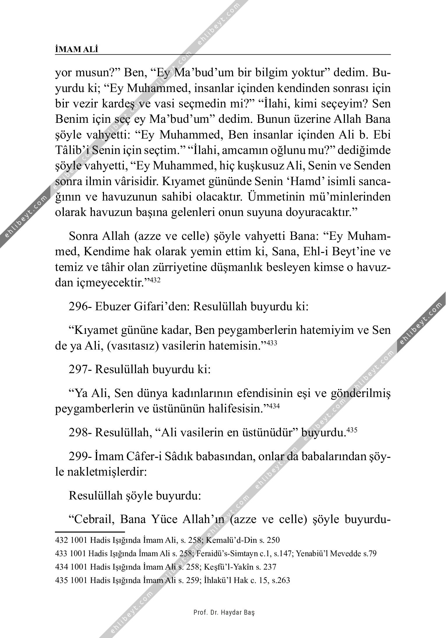 yor musun?" Ben, "Ey Ma'bud'um bir bilgim yoktur" dedim. Buyurdu ki; "Ey Muhammed, insanlar içinden kendinden sonrası için bir vezir kardeş ve vasi seçmedin mi?" "İlahi, kimi seçeyim? Sen Benim için seç ey Ma'bud'um" dedim. Bunun üzerine Allah Bana şöyle vahyetti: "Ey Muhammed, Ben insanlar içinden Ali b. Ebi Tâlib'i Senin için seçtim." "İlahi, amcamın oğlunu mu?" dediğimde şöyle vahyetti, "Ey Muhammed, hiç kuşkusuz Ali, Senin ve Senden sonra ilmin vârisidir. Kıyamet gününde Senin `Hamd' isimli sancağının ve havuzunun sahibi olacaktır. Ümmetinin mü'minlerinden olarak havuzun başına gelenleri onun suyuna doyuracaktır." Sonra Allah (azze ve celle) şöyle vahyetti Bana: "Ey Muhammed, Kendime hak olarak yemin ettim ki, Sana, Ehl-i Beyt'ine ve temiz ve tâhir olan zürriyetine düşmanlık besleyen kimse o havuzdan içmeyecektir."432 296- Ebuzer Gifari'den: Resulüllah buyurdu ki: "Kıyamet gününe kadar, Ben peygamberlerin hatemiyim ve Sen de ya Ali, (vasıtasız) vasilerin hatemisin."433 297- Resulüllah buyurdu ki: "Ya […]