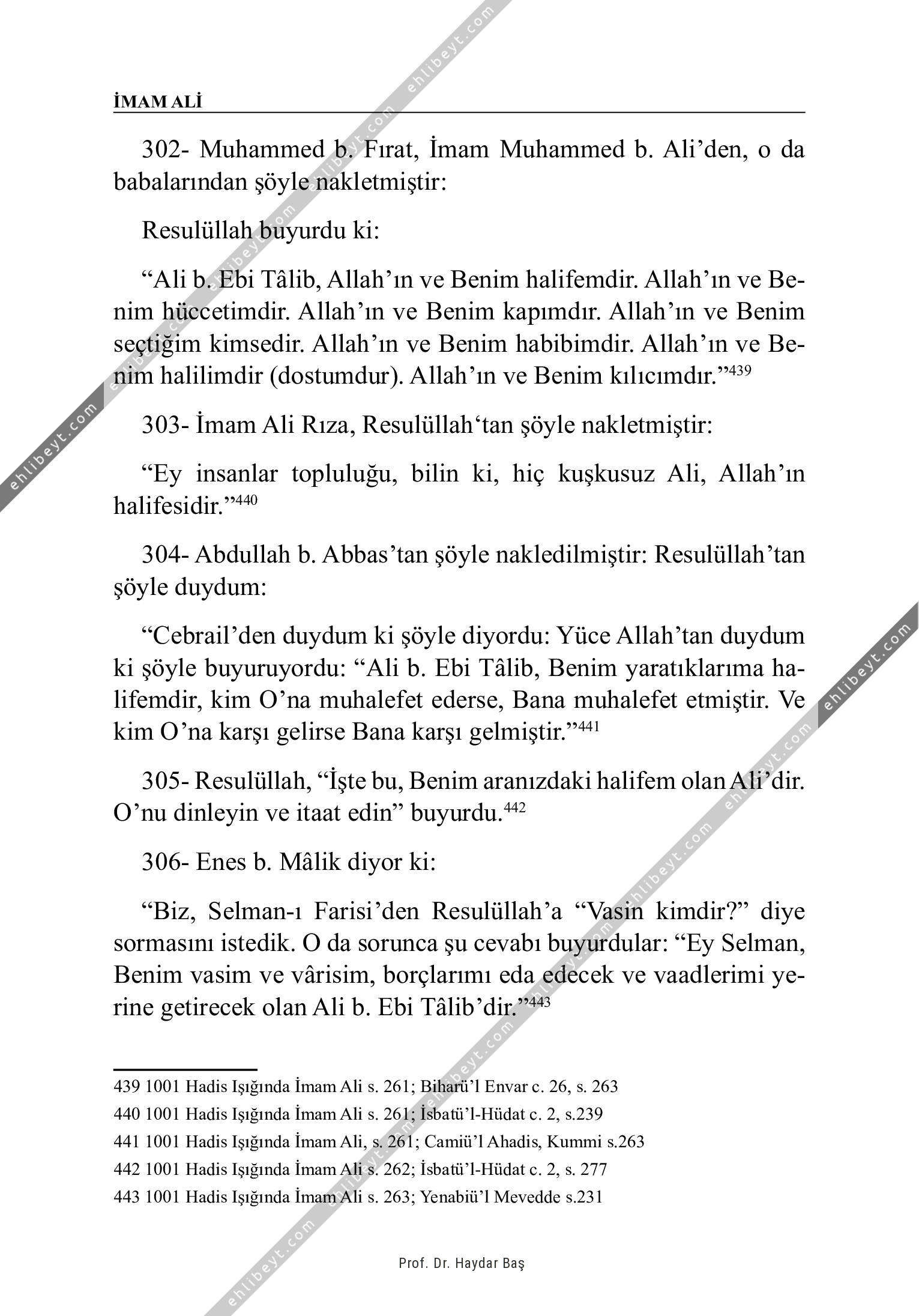302- Muhammed b. Fırat, İmam Muhammed b. Ali'den, o da babalarından şöyle nakletmiştir: Resulüllah buyurdu ki: "Ali b. Ebi Tâlib, Allah'ın ve Benim halifemdir. Allah'ın ve Benim hüccetimdir. Allah'ın ve Benim kapımdır. Allah'ın ve Benim seçtiğim kimsedir. Allah'ın ve Benim habibimdir. Allah'ın ve Benim halilimdir (dostumdur). Allah'ın ve Benim kılıcımdır."439 303- İmam Ali Rıza, Resulüllah`tan şöyle nakletmiştir: "Ey insanlar topluluğu, bilin ki, hiç kuşkusuz Ali, Allah'ın halifesidir."440 304- Abdullah b. Abbas'tan şöyle nakledilmiştir: Resulüllah'tan şöyle duydum: "Cebrail'den duydum ki şöyle diyordu: Yüce Allah'tan duydum ki şöyle buyuruyordu: "Ali b. Ebi Tâlib, Benim yaratıklarıma halifemdir, kim O'na muhalefet ederse, Bana muhalefet etmiştir. Ve kim O'na karşı gelirse Bana karşı gelmiştir."441 305- Resulüllah, "İşte bu, Benim aranızdaki halifem olan Ali'dir. O'nu dinleyin ve itaat edin" buyurdu.442 306- Enes b. Mâlik diyor ki: "Biz, Selman-ı Farisi'den Resulüllah'a "Vasin kimdir?" diye sormasını istedik. O da sorunca şu cevabı buyurdular: "Ey Selman, […]
