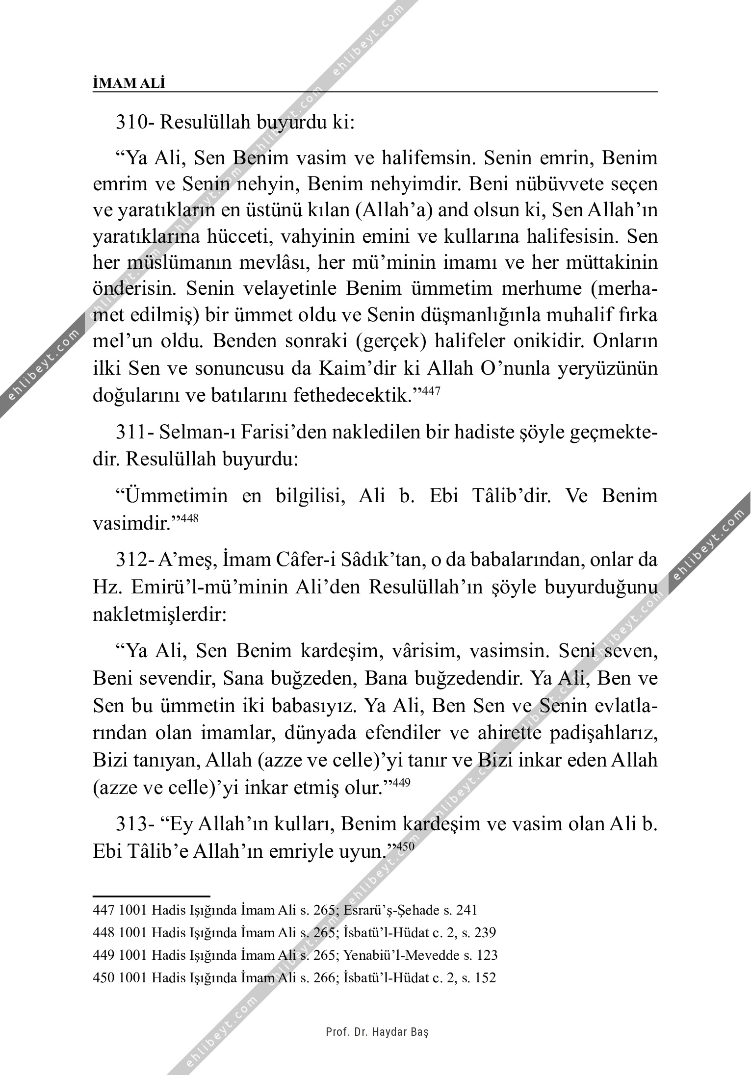 310- Resulüllah buyurdu ki: "Ya Ali, Sen Benim vasim ve halifemsin. Senin emrin, Benim emrim ve Senin nehyin, Benim nehyimdir. Beni nübüvvete seçen ve yaratıkların en üstünü kılan (Allah'a) and olsun ki, Sen Allah'ın yaratıklarına hücceti, vahyinin emini ve kullarına halifesisin. Sen her müslümanın mevlâsı, her mü'minin imamı ve her müttakinin önderisin. Senin velayetinle Benim ümmetim merhume (merhamet edilmiş) bir ümmet oldu ve Senin düşmanlığınla muhalif fırka mel'un oldu. Benden sonraki (gerçek) halifeler onikidir. Onların ilki Sen ve sonuncusu da Kaim'dir ki Allah O'nunla yeryüzünün doğularını ve batılarını fethedecektik."447 311- Selman-ı Farisi'den nakledilen bir hadiste şöyle geçmektedir. Resulüllah buyurdu: "Ümmetimin en bilgilisi, Ali b. Ebi Tâlib'dir. Ve Benim vasimdir."448 312- A'meş, İmam Câfer-i Sâdık'tan, o da babalarından, onlar da Hz. Emirü'l-mü'minin Ali'den Resulüllah'ın şöyle buyurduğunu nakletmişlerdir: "Ya Ali, Sen Benim kardeşim, vârisim, vasimsin. Seni seven, Beni sevendir, Sana buğzeden, Bana buğzedendir. Ya Ali, Ben ve Sen bu ümmetin […]