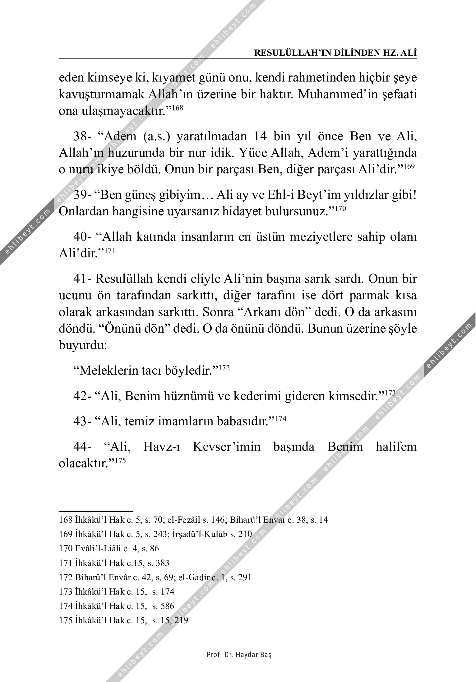 eden kimseye ki, kıyamet günü onu, kendi rahmetinden hiçbir şeye kavuşturmamak Allah'ın üzerine bir haktır. Muhammed'in şefaati ona ulaşmayacaktır."168 38- "Adem (a.s.) yaratılmadan 14 bin yıl önce Ben ve Ali, Allah'ın huzurunda bir nur idik. Yüce Allah, Adem'i yarattığında o nuru ikiye böldü. Onun bir parçası Ben, diğer parçası Ali'dir."169 39- "Ben güneş gibiyim... Ali ay ve Ehl-i Beyt'im yıldızlar gibi! Onlardan hangisine uyarsanız hidayet bulursunuz."170 40- "Allah katında insanların en üstün meziyetlere sahip olanı Ali'dir."171 41- Resulüllah kendi eliyle Ali'nin başına sarık sardı. Onun bir ucunu ön tarafından sarkıttı, diğer tarafını ise dört parmak kısa olarak arkasından sarkıttı. Sonra "Arkanı dön" dedi. O da arkasını döndü. "Önünü dön" dedi. O da önünü döndü. Bunun üzerine şöyle buyurdu: "Meleklerin tacı böyledir."172 42- "Ali, Benim hüznümü ve kederimi gideren kimsedir."173 43- "Ali, temiz imamların babasıdır."174 44- "Ali, Havz-ı Kevser'imin başında Benim halifem olacaktır."175   168 İhkâkü'l Hak c. 5, s. 70; […]