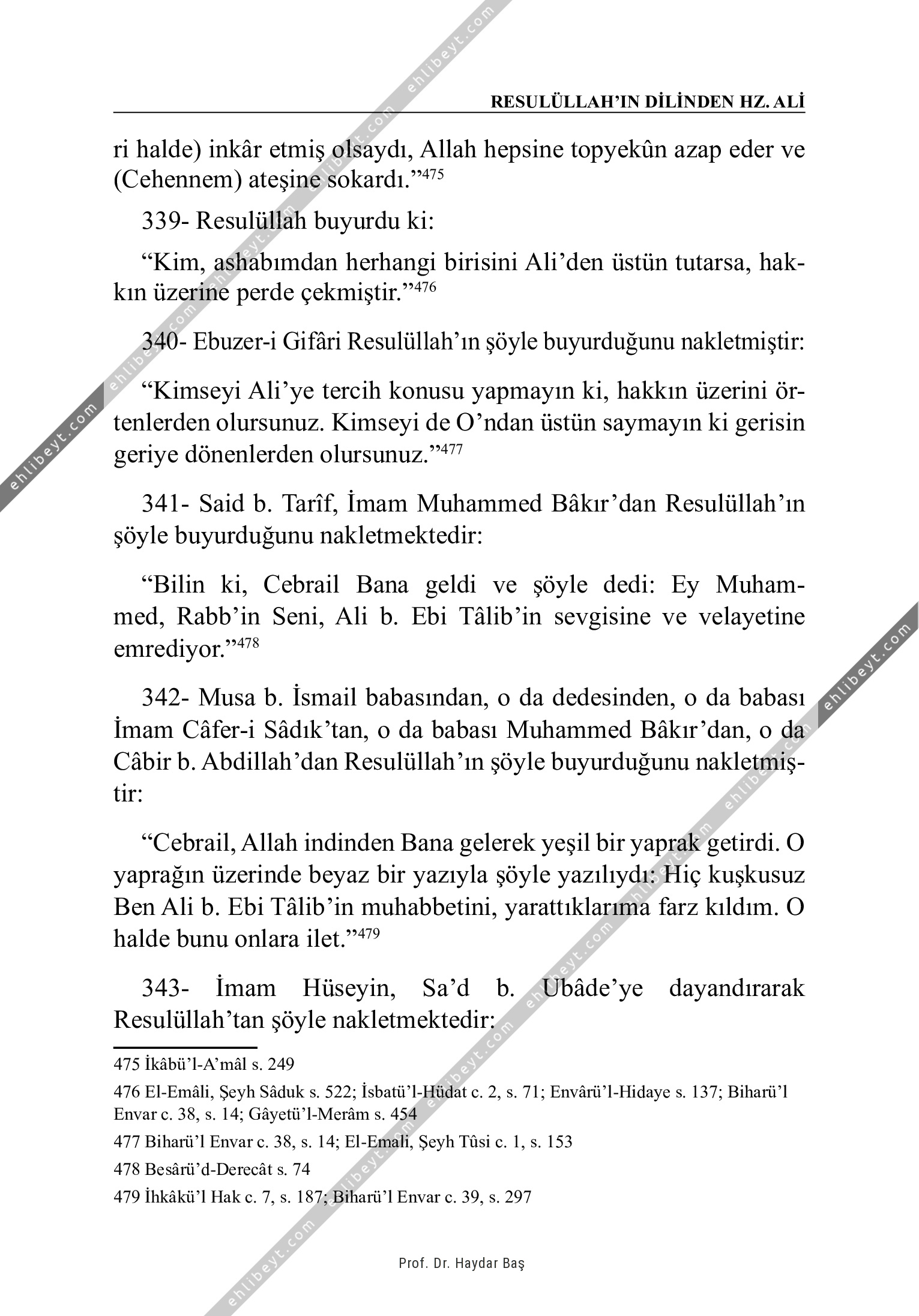 ri halde) inkâr etmiş olsaydı, Allah hepsine topyekûn azap eder ve (Cehennem) ateşine sokardı."475 339- Resulüllah buyurdu ki: "Kim, ashabımdan herhangi birisini Ali'den üstün tutarsa, hakkın üzerine perde çekmiştir."476 340- Ebuzer-i Gifâri Resulüllah'ın şöyle buyurduğunu nakletmiştir: "Kimseyi Ali'ye tercih konusu yapmayın ki, hakkın üzerini örtenlerden olursunuz. Kimseyi de O'ndan üstün saymayın ki gerisin geriye dönenlerden olursunuz."477 341- Said b. Tarîf, İmam Muhammed Bâkır'dan Resulüllah'ın şöyle buyurduğunu nakletmektedir: "Bilin ki, Cebrail Bana geldi ve şöyle dedi: Ey Muhammed, Rabb'in Seni, Ali b. Ebi Tâlib'in sevgisine ve velayetine emrediyor."478 342- Musa b. İsmail babasından, o da dedesinden, o da babası İmam Câfer-i Sâdık'tan, o da babası Muhammed Bâkır'dan, o da Câbir b. Abdillah'dan Resulüllah'ın şöyle buyurduğunu nakletmiştir: "Cebrail, Allah indinden Bana gelerek yeşil bir yaprak getirdi. O yaprağın üzerinde beyaz bir yazıyla şöyle yazılıydı: Hiç kuşkusuz Ben Ali b. Ebi Tâlib'in muhabbetini, yarattıklarıma farz kıldım. O halde bunu […]