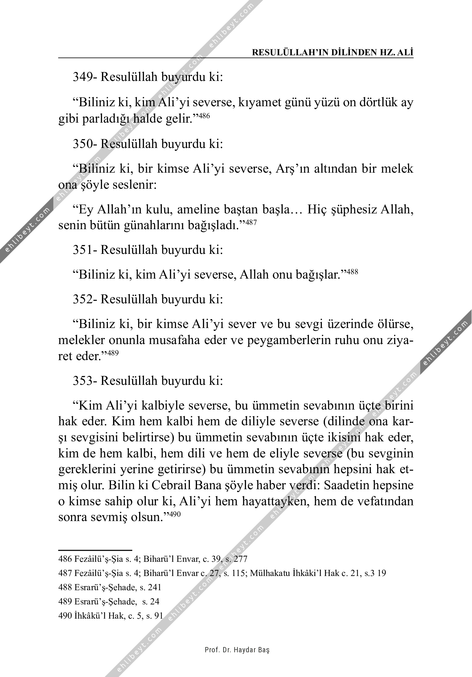 349- Resulüllah buyurdu ki: "Biliniz ki, kim Ali'yi severse, kıyamet günü yüzü on dörtlük ay gibi parladığı halde gelir."486 350- Resulüllah buyurdu ki: "Biliniz ki, bir kimse Ali'yi severse, Arş'ın altından bir melek ona şöyle seslenir: "Ey Allah'ın kulu, ameline baştan başla... Hiç şüphesiz Allah, senin bütün günahlarını bağışladı."487 351- Resulüllah buyurdu ki: "Biliniz ki, kim Ali'yi severse, Allah onu bağışlar."488 352- Resulüllah buyurdu ki: "Biliniz ki, bir kimse Ali'yi sever ve bu sevgi üzerinde ölürse, melekler onunla musafaha eder ve peygamberlerin ruhu onu ziyaret eder."489 353- Resulüllah buyurdu ki: "Kim Ali'yi kalbiyle severse, bu ümmetin sevabının üçte birini hak eder. Kim hem kalbi hem de diliyle severse (dilinde ona karşı sevgisini belirtirse) bu ümmetin sevabının üçte ikisini hak eder, kim de hem kalbi, hem dili ve hem de eliyle severse (bu sevginin gereklerini yerine getirirse) bu ümmetin sevabının hepsini hak etmiş olur. Bilin ki Cebrail Bana […]