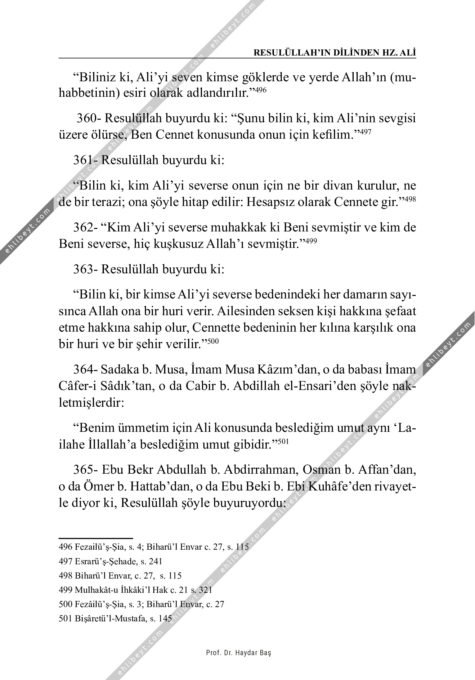 "Biliniz ki, Ali'yi seven kimse göklerde ve yerde Allah'ın (muhabbetinin) esiri olarak adlandırılır."496 360- Resulüllah buyurdu ki: "Şunu bilin ki, kim Ali'nin sevgisi üzere ölürse, Ben Cennet konusunda onun için kefilim."497 361- Resulüllah buyurdu ki: "Bilin ki, kim Ali'yi severse onun için ne bir divan kurulur, ne de bir terazi; ona şöyle hitap edilir: Hesapsız olarak Cennete gir."498 362- "Kim Ali'yi severse muhakkak ki Beni sevmiştir ve kim de Beni severse, hiç kuşkusuz Allah'ı sevmiştir."499 363- Resulüllah buyurdu ki: "Bilin ki, bir kimse Ali'yi severse bedenindeki her damarın sayısınca Allah ona bir huri verir. Ailesinden seksen kişi hakkına şefaat etme hakkına sahip olur, Cennette bedeninin her kılına karşılık ona bir huri ve bir şehir verilir."500 364- Sadaka b. Musa, İmam Musa Kâzım'dan, o da babası İmam Câfer-i Sâdık'tan, o da Cabir b. Abdillah el-Ensari'den şöyle nakletmişlerdir: "Benim ümmetim için Ali konusunda beslediğim umut aynı `Lailahe İllallah'a […]