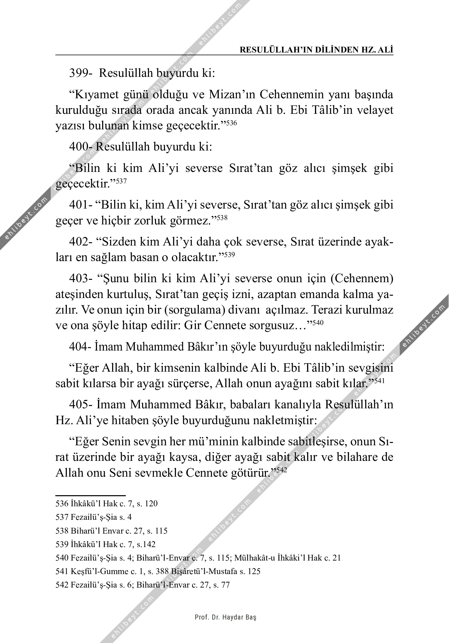 399- Resulüllah buyurdu ki: "Kıyamet günü olduğu ve Mizan'ın Cehennemin yanı başında kurulduğu sırada orada ancak yanında Ali b. Ebi Tâlib'in velayet yazısı bulunan kimse geçecektir."536 400- Resulüllah buyurdu ki: "Bilin ki kim Ali'yi severse Sırat'tan göz alıcı şimşek gibi geçecektir."537 401- "Bilin ki, kim Ali'yi severse, Sırat'tan göz alıcı şimşek gibi geçer ve hiçbir zorluk görmez."538 402- "Sizden kim Ali'yi daha çok severse, Sırat üzerinde ayakları en sağlam basan o olacaktır."539 403- "Şunu bilin ki kim Ali'yi severse onun için (Cehennem) ateşinden kurtuluş, Sırat'tan geçiş izni, azaptan emanda kalma yazılır. Ve onun için bir (sorgulama) divanı açılmaz. Terazi kurulmaz ve ona şöyle hitap edilir: Gir Cennete sorgusuz..."540 404- İmam Muhammed Bâkır'ın şöyle buyurduğu nakledilmiştir: "Eğer Allah, bir kimsenin kalbinde Ali b. Ebi Tâlib'in sevgisini sabit kılarsa bir ayağı sürçerse, Allah onun ayağını sabit kılar."541 405- İmam Muhammed Bâkır, babaları kanalıyla Resulüllah'ın Hz. Ali'ye hitaben şöyle buyurduğunu nakletmiştir: […]